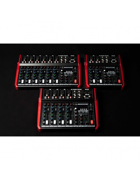 I mixer PLAYMIX sono disponibili in 3 modelli, con le stesse funzioni di canale e master, ma con 6, 8 e 10 canali rispettivamente. I canali mono MIC/LINE includono preamplificatori microfonici a basso rumore e ad alta dinamica, equalizzatori a tre bande con MID parametrici e filtro HPF, e fader da 60 mm per un controllo completo del suono.