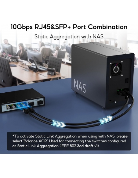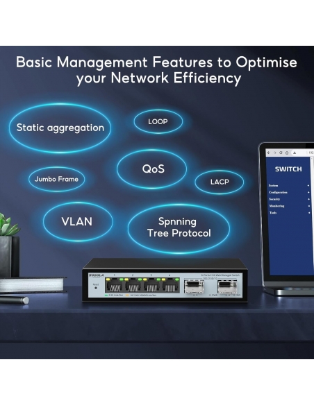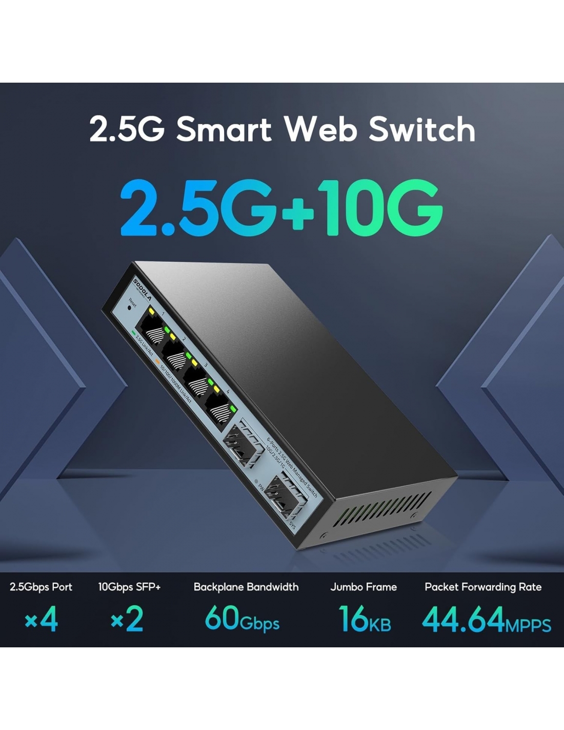 - Velocità scatenata: switch 2,5 GbE a 6 porte con 4 porte RJ45 100/1000/2500 M + 2 porte SFP+ 10 G per una connettività di rete veloce da 2,5 GB.