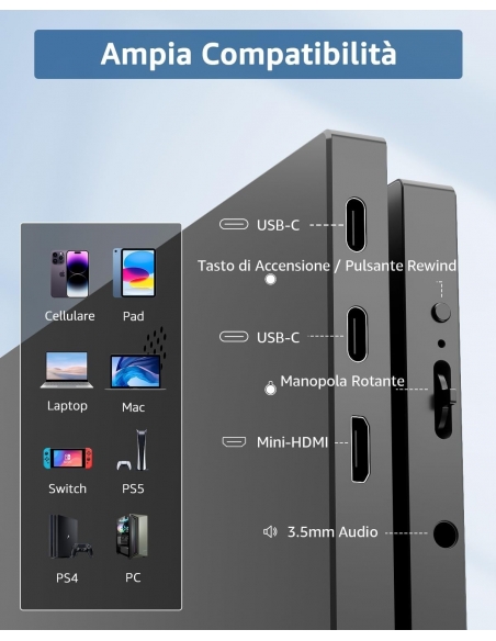 - Dotato di doppi ingressi USB-C e un ingresso mini HDMI, il monitor si collega perfettamente a una vasta gamma di dispositivi, tra cui PC, Mac, laptop, telefoni e dispositivi di gioco come Xbox, Switch, PS4/5.