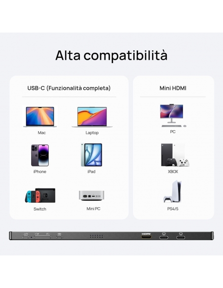 - Trasforma il tuo modo di lavorare e giocare. Utilizza lo Z1C come secondo schermo per il laptop per espandere la tua area di lavoro, o collegalo facilmente a PC, Mac, smartphone (con modalità desktop) e console come PlayStation, Xbox e Switch tramite le porte USB-C 3.1 (supporto PD/DP) e Mini HDMI 2.0.