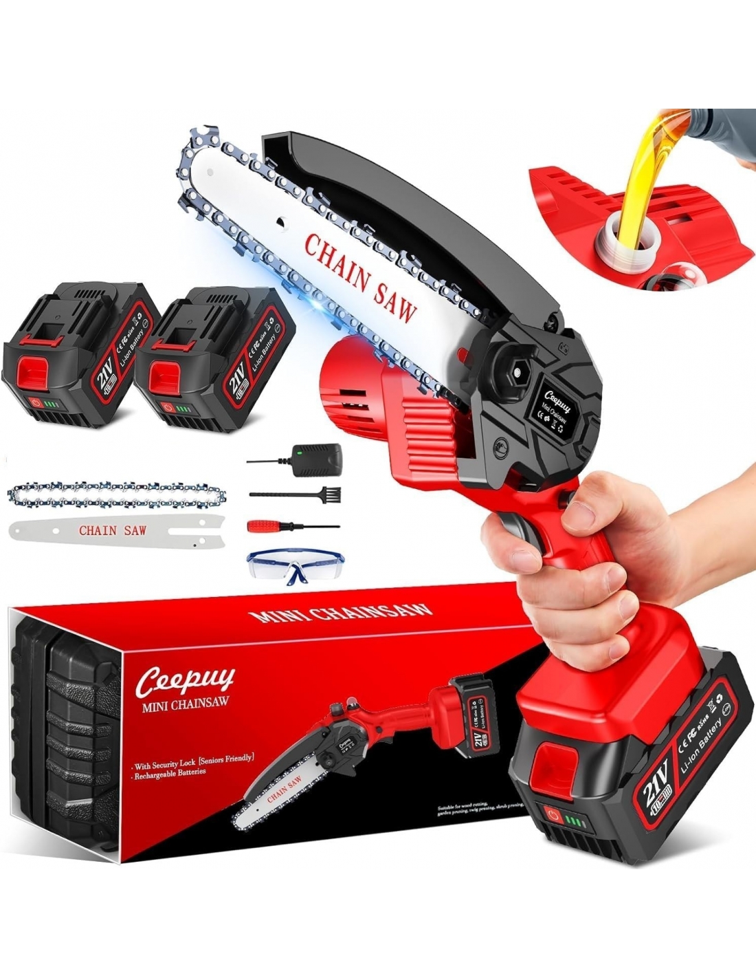 CEEPUY Mini Motosega a Batteria per Potatura, 880w 6 Pollici Sega a Batteria per Potatura con Pompetta Olio, Elettrica Motosega per Il Taglio Del Legno Giardini [Classe di efficienza energetica A+++]
