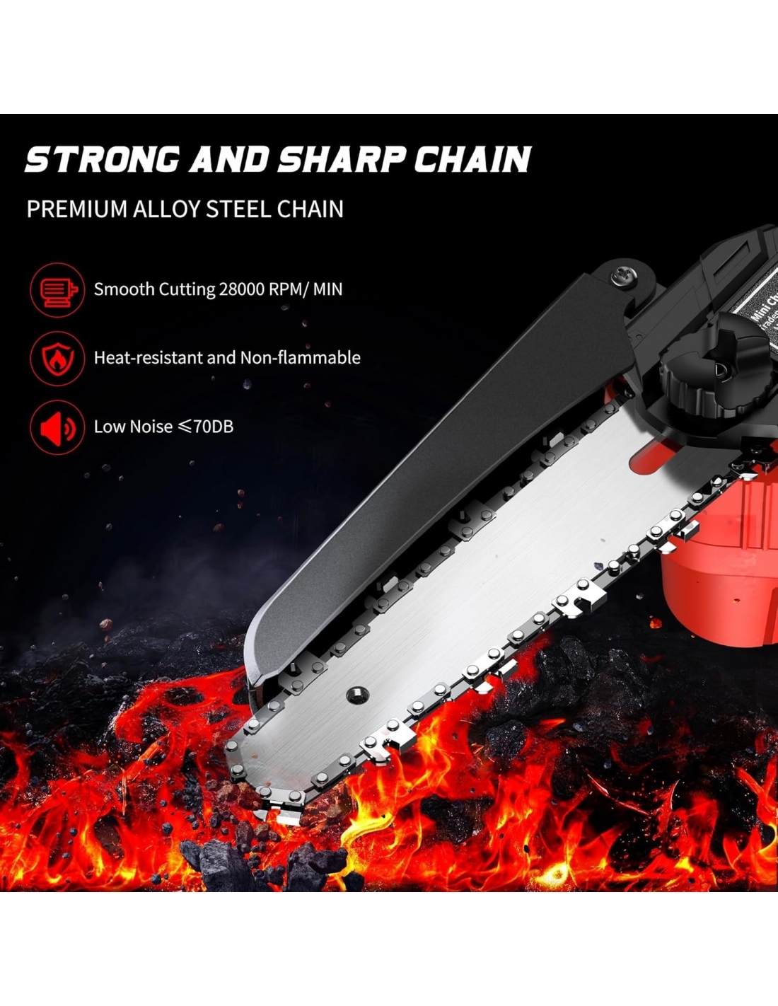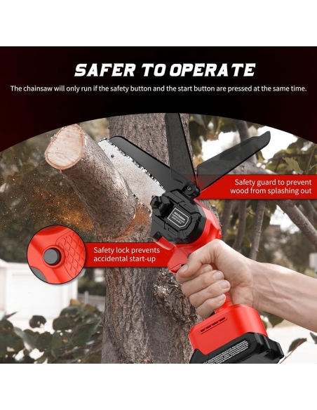- Doppia protezione di sicurezza: la motosega a batteria è dotata di un blocco di sicurezza a doppia attivazione per garantire che possa essere avviata solo quando vengono premuti due pulsanti indipendenti contemporaneamente, prevenendo efficacemente il rischio di attivazione accidentale; inoltre, la protezione della lama della mini motosega è progettata per evitare che tu ti faccia male durante l'uso, impedendo anche che i trucioli di legno ti schizzino addosso.