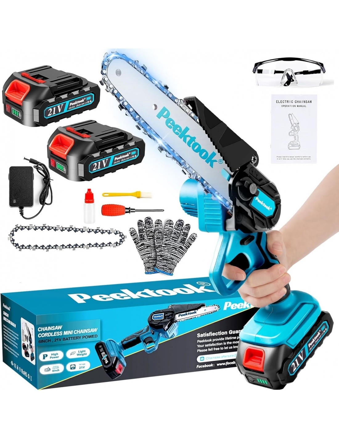 - 【Motosega a Batteria con Motore Brushless da 1000W】Il motore senza spazzole è il cuore della motosega. La Mini Motosega a Batteria Peektook è dotata di un motore brushless ad alta potenza da 1000 W che può azionare la catena per tagliare ad una velocità elevata di 10 m/s. Il motore senza spazzole garantisce che la sega non si bruci durante l'uso e possa essere utilizzata continuamente. Ciò rende il taglio di rami o tronchi facile e veloce, risparmiando molto tempo ed energia!