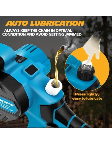 - Sistema di riempimento automatico dell'olio: questa mini motosega a batteria è dotata di un sistema di lubrificazione della catena. Basta versare l'olio (normale olio motore) nel serbatoio dell'olio e premere il foro della bolla per lubrificare la catena, ridurre l'usura, rendere il taglio più fluido e tagliare di più. Un riempimento dell'olio può essere utilizzato per un giorno intero, non c'è bisogno di portare con sé una pesante bottiglia di olio lubrificante!