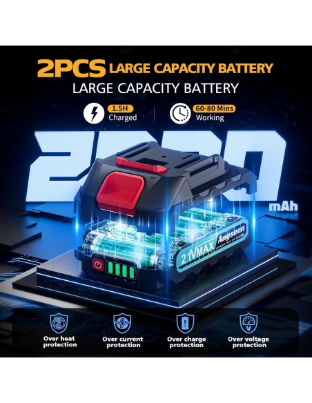 - Batteria ricaricabile di grande capacità: La mini motosega a batteria è dotata di 2 batterie agli ioni di litio da 2000mAh e 1 caricabatterie. Può funzionare in modo continuo per 60-80 minuti. È in grado di massimizzare la produttività e farti risparmiare molto tempo. Il tempo di ricarica è solo di 1,5 ore, comodo e veloce. Se non viene utilizzata per lungo tempo, carica completamente la batteria prima dell'uso per un'esperienza migliore.