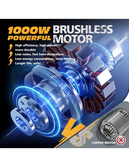 - !!!Altre motoseghe tradizionali a spazzole possono bruciarsi o surriscaldarsi e smettere di funzionare dopo un uso prolungato, ma le nostre motoseghe brushless non avranno mai questi problemi!!! Sistema brushless potente: La motosega brushless Angseen è dotata di un potente motore da 1000W. Rispetto alle altre motoseghe senza filo dotate di motori in rame, la nostra motosega per potatura può sempre lavorare in modo efficiente e può tagliare perfettamente legno di 6 pollici in soli 6 secondi.