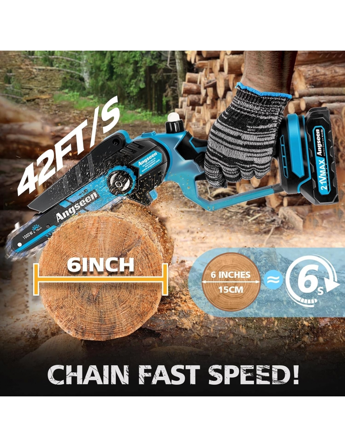 ANGSEEN Sy-15 blu Mini Motosega a Batteria per Potatura con 1000W Motore Brushless, 4000mAh Batterie, Manopola Regola Subito la Tensione Della Catena, 6 Pollici Sega Con Pompetta Olio per Il Taglio del Legno Giardini