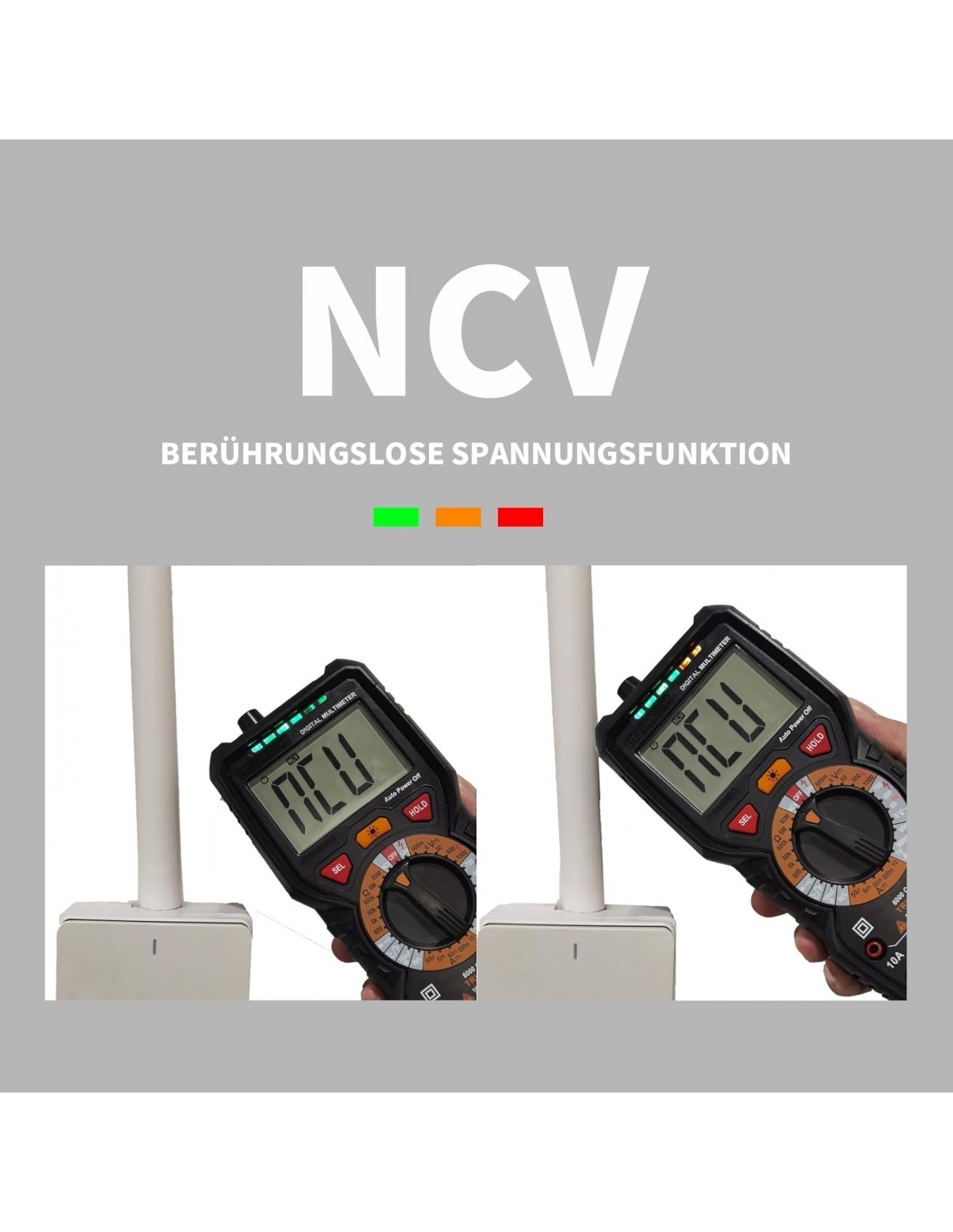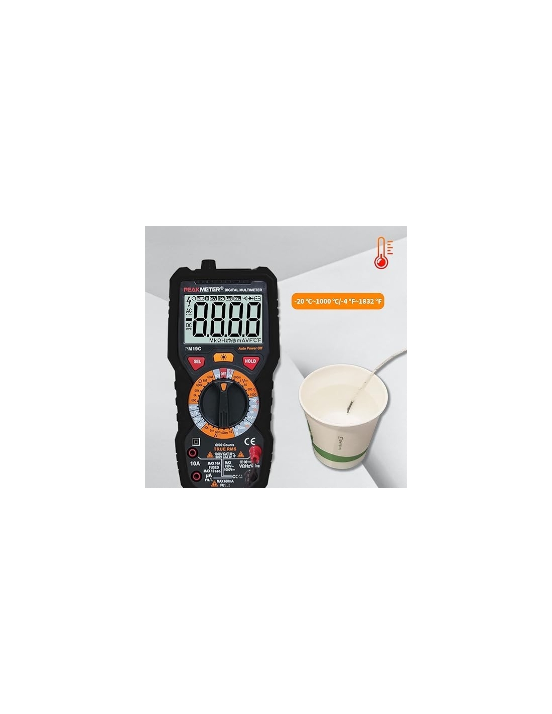 - Campo di misura: tensione CC: 600mV-1000V. Tensione CA: 6V-750V. Corrente CC: 60μ A-10A. Corrente CA: 60mA-10A. Resistenza: 600Ω a 60MΩ Capacità: 6nF-100mF Temperatura: -20℃-1000℃/-4 ℉-1832 ℉. Un grande display con 6000 conteggi, retroilluminazione e torcia elettrica, si può leggere facilmente anche al buio
