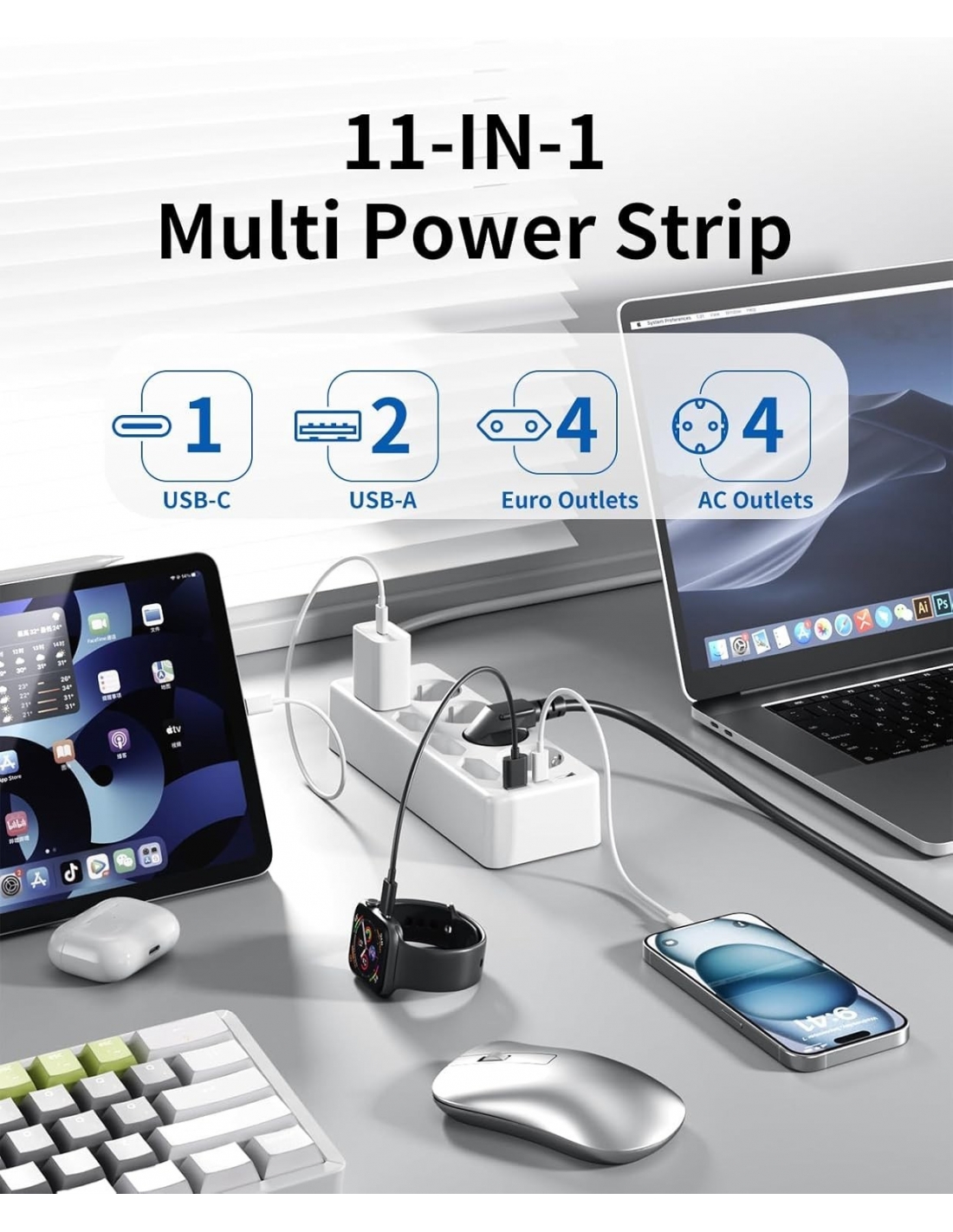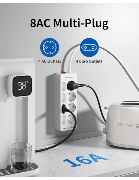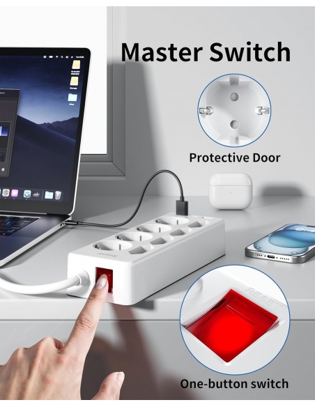 - 【11 in 1 Ciabatta Multipresa】 La ciabatta è dotata di 2 USB-A (5V/2.4A) e 1 USB-C (5V/3.0A) per la ricarica rapida di più dispositivi, estensione della spina 4 prese Schuko AC e 4 prese Euro AC, che supportano una potenza di uscita massima totale di 4000W/16A.