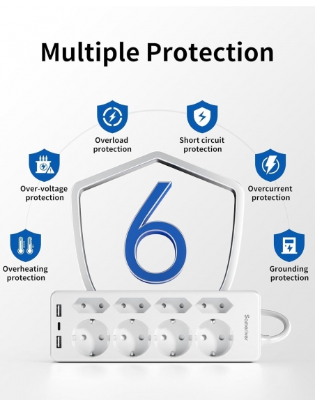 - 【Protezione contro le sovratensioni a uscita multipla】La multiuscita con USB ha superato la certificazione CE e utilizza materiali ignifughi avanzati. Quando l'alimentazione è sovraccarica / surriscaldata / in cortocircuito, l'affidabile interruttore di sovratensione scatta automaticamente per proteggere i dispositivi.