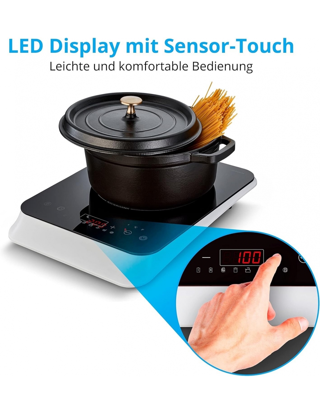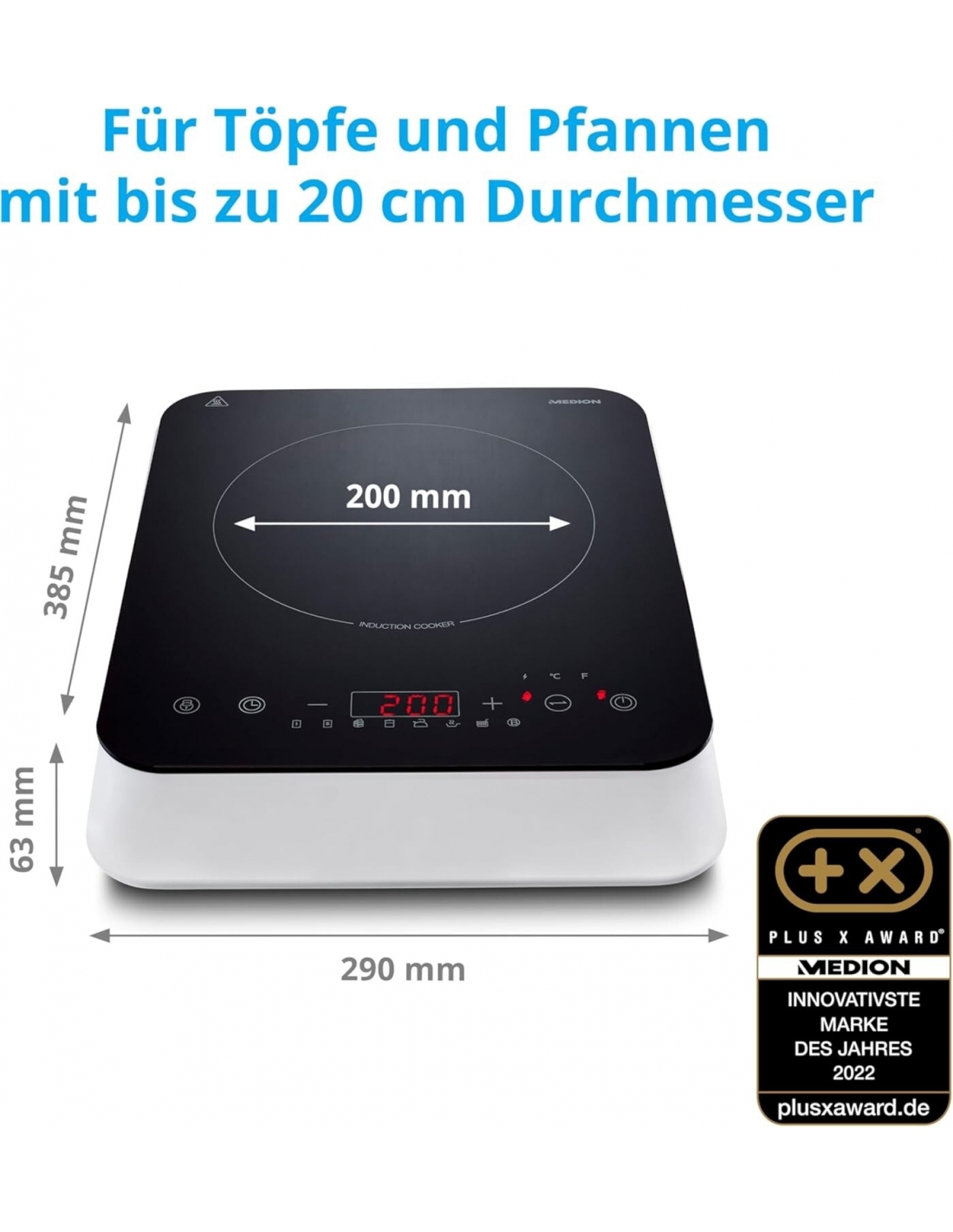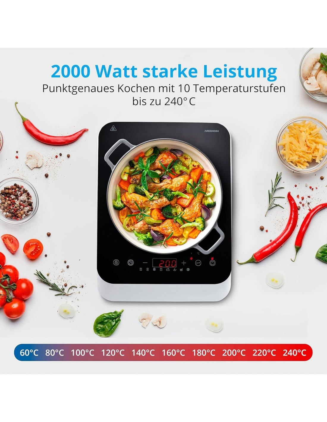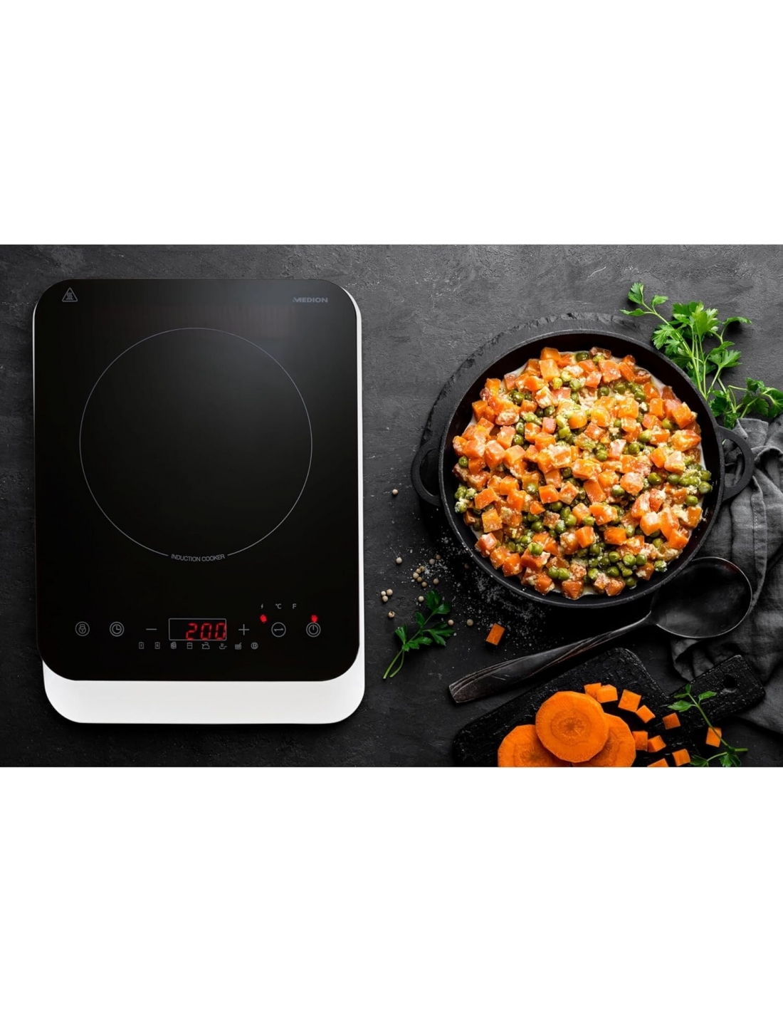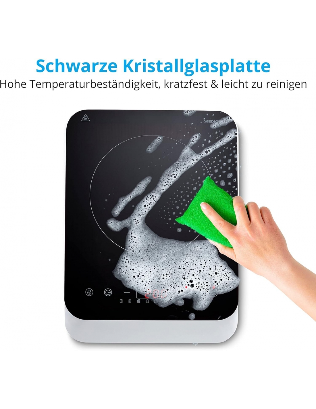 Piano cottura a induzione MEDION MD18490 (1 piastra, piano cottura a induzione 20 cm, piastra a induzione da 2.000 Watt, 1 piano cottura con 10 livelli di temperatura e rilevamento pentola, piastra in cristallo, MD18490)