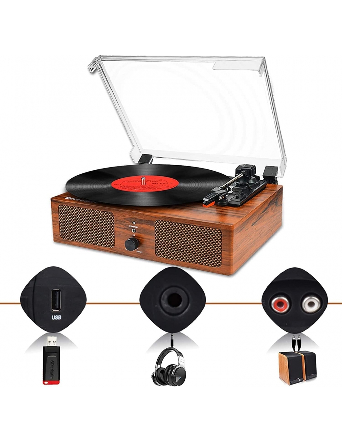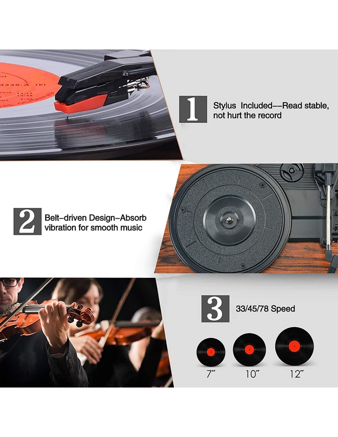 【Funzione di ingresso Bluetooth】Questo giradischi è dotato di funzione Bluetooth integrata. Può essere abbinato a dispositivi Bluetooth compatibili come cellulari, tablet e laptop, per ascoltare facilmente la tua musica preferita dal moderno mondo digitale.【Altoparlanti stereo integrati】Il nostro giradischi vintage è dotato di due altoparlanti stereo da 3 W integrati che offrono un suono chiaro e bilanciato. Rappresenta un enorme miglioramento rispetto al precedente giradischi con altoparlanti stereo integrati.【3 VELOCITÀ E 3 DIMENSIONI DISCHI】Supporta 3 velocità di ascolto (33-1/3, 45 e 78 giri/min) e 3 dimensioni di dischi (7", 10" e 12"). Goditi i tuoi momenti di relax con questo giradischi.【FACILE DA USARE】Realizzato in scatole di legno leggere e resistenti. Aspetto e design retrò, facile da usare per qualsiasi utente.【Ammortizzatore per giradischi e cinghia】Base del giradischi con design a molla e cinghia, in grado di assorbire fortemente gli urti e offrire musica fluida e di alta qualità.