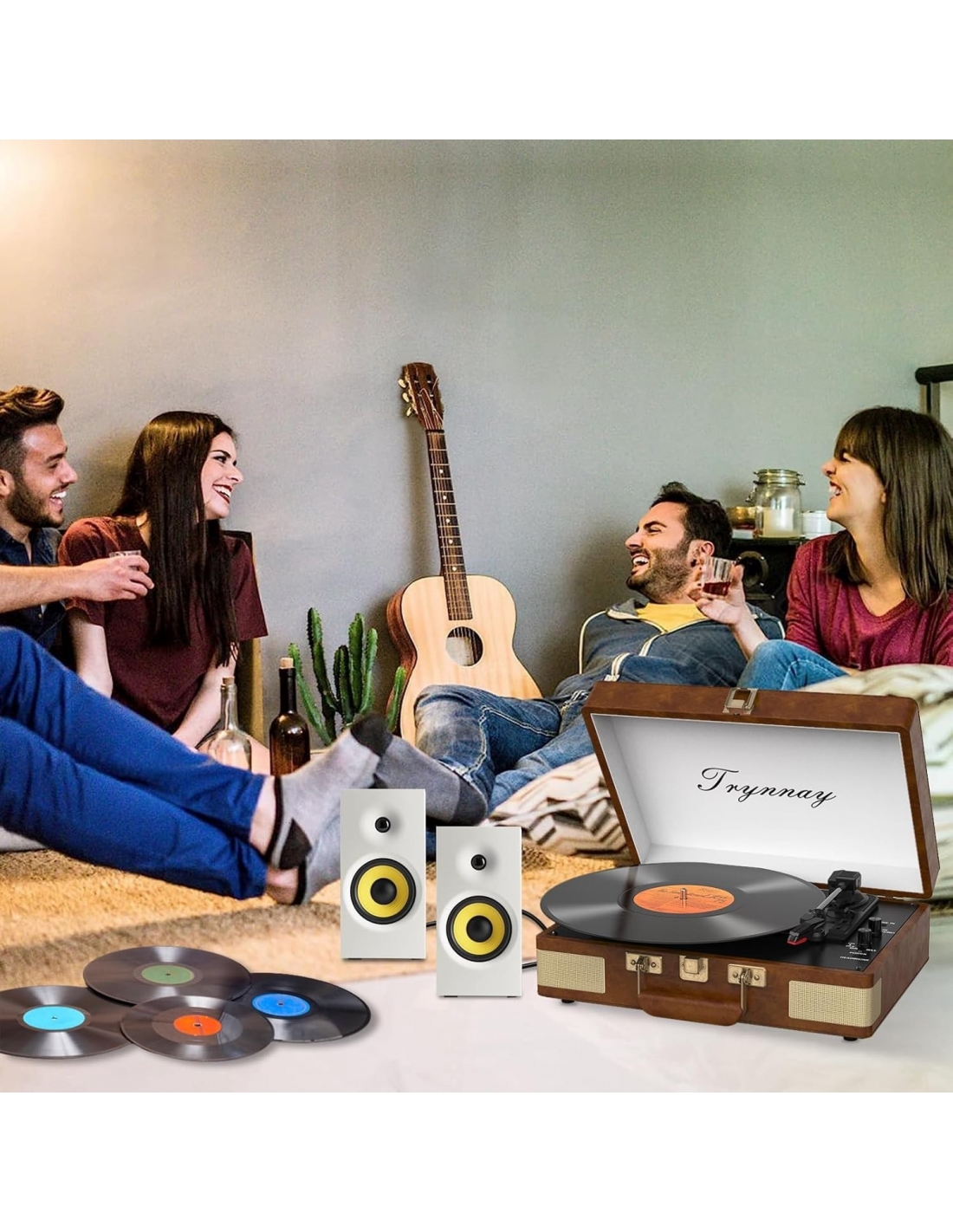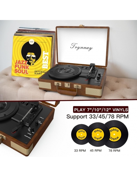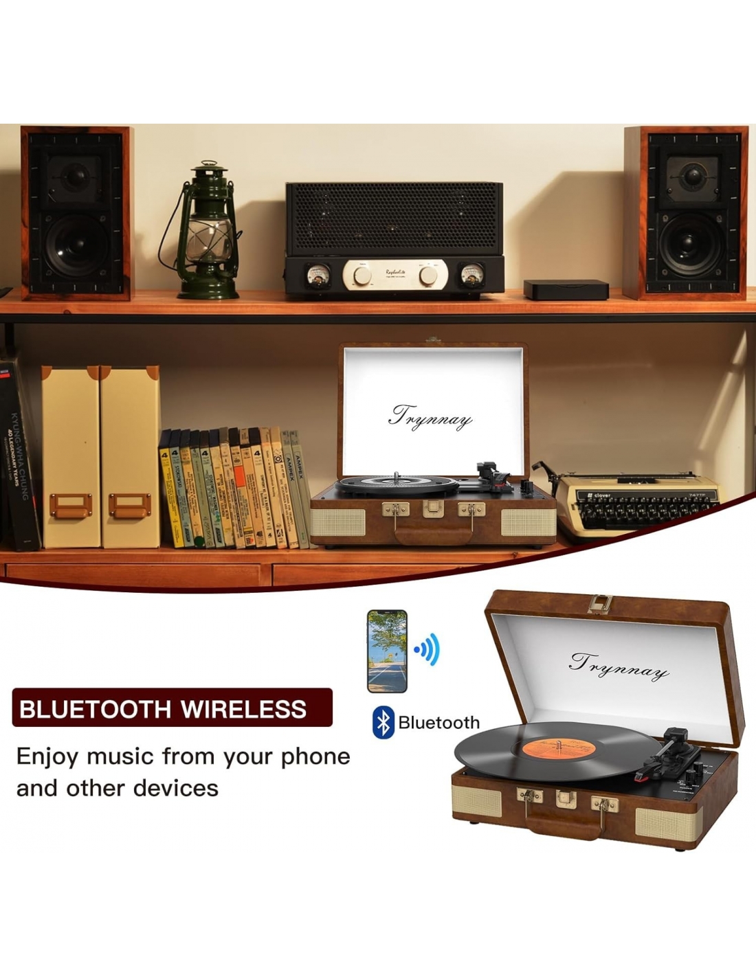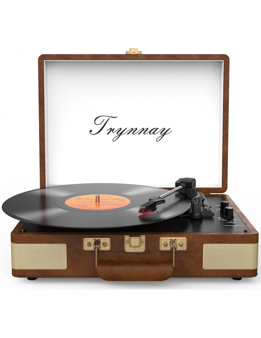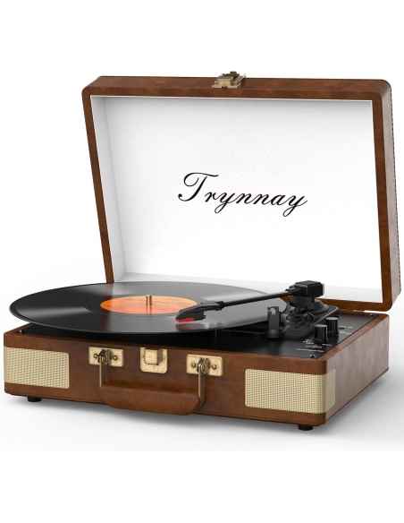 Trynnay Giradischi a 3 marce, lettore portatile in vinile con altoparlanti integrati, giradischi, audio migliorato, pelle PU, vintage marrone