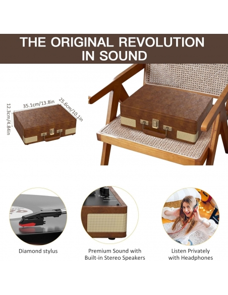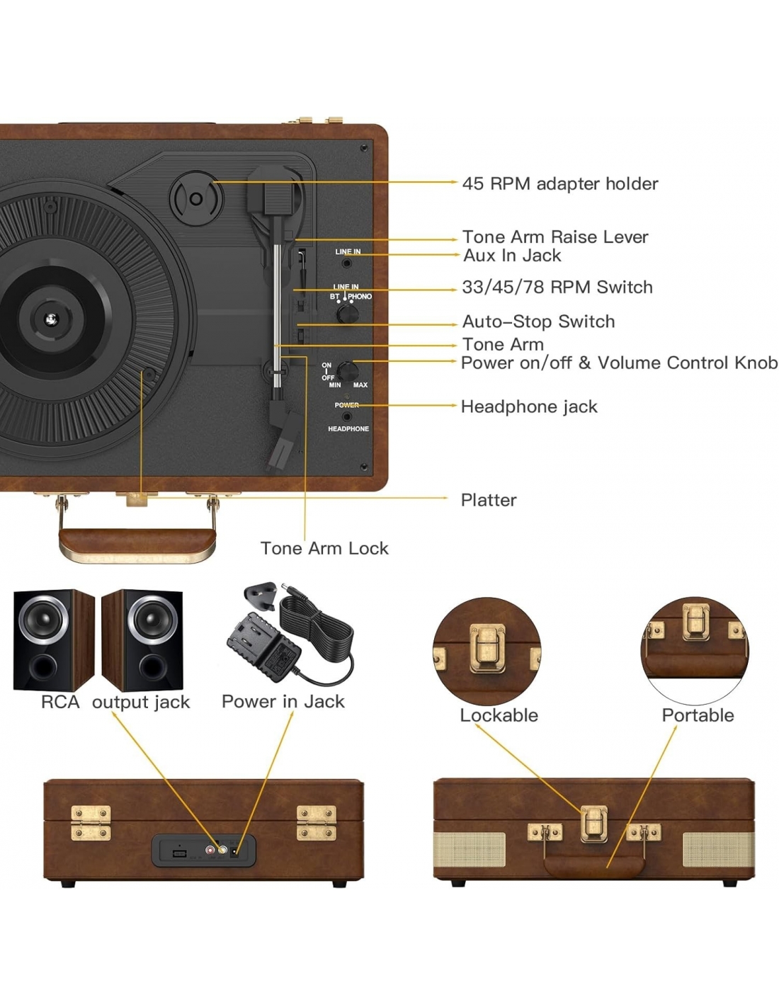 - ✔ 【Turntable with strap-drive and three speed】 Questo giradischi valigia a tre velocità (33 1/3, 45, 78 giri/min) dispone di una migliore qualità del suono premium. Supporta anche 3 dimensioni di dischi da 7/10/12 pollici.