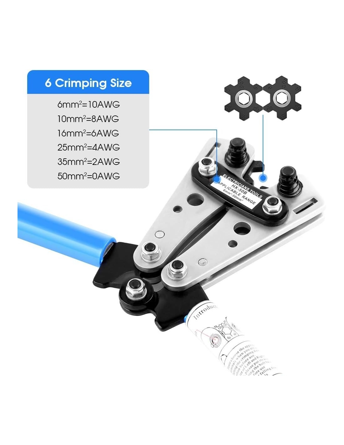 - 【 Crimpatrice in acciaio al carbonio + impugnatura in gomma 】 Realizzato in acciaio al carbonio temprato di tipo esagonale, funziona per cavi nudi con una capacità di 6-50 mm², è solido e durevole e può ottenere buon effetto di crimpatura. Spessa e rinforza la piastra sulla testa della crimpatrice per renderla più resistente