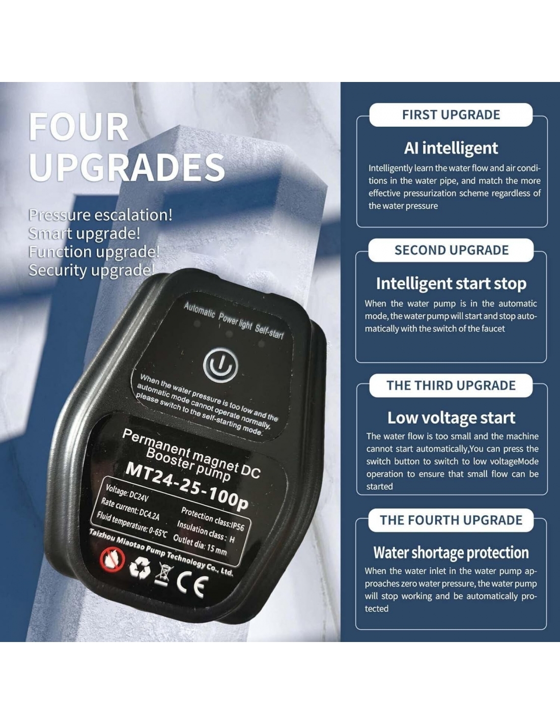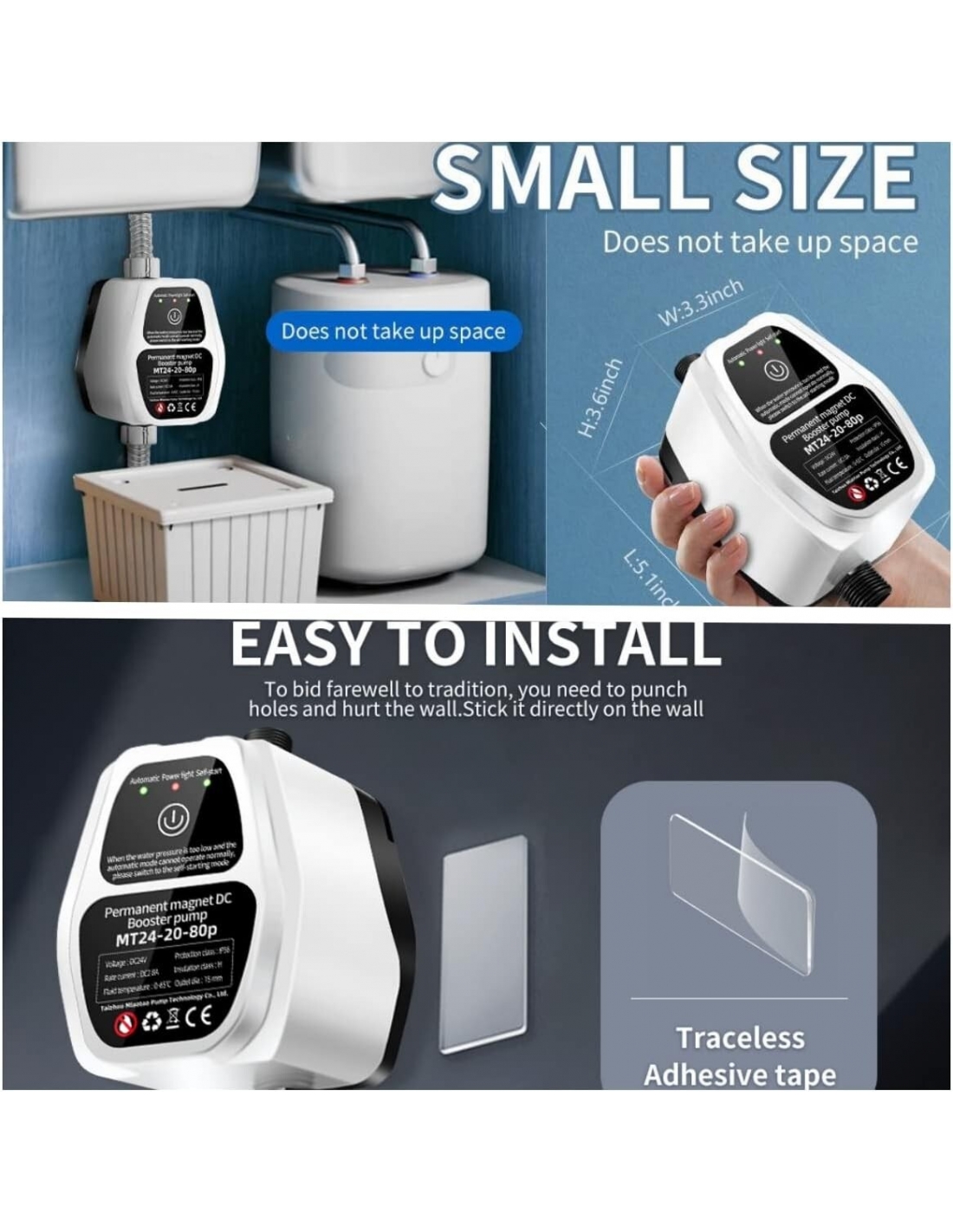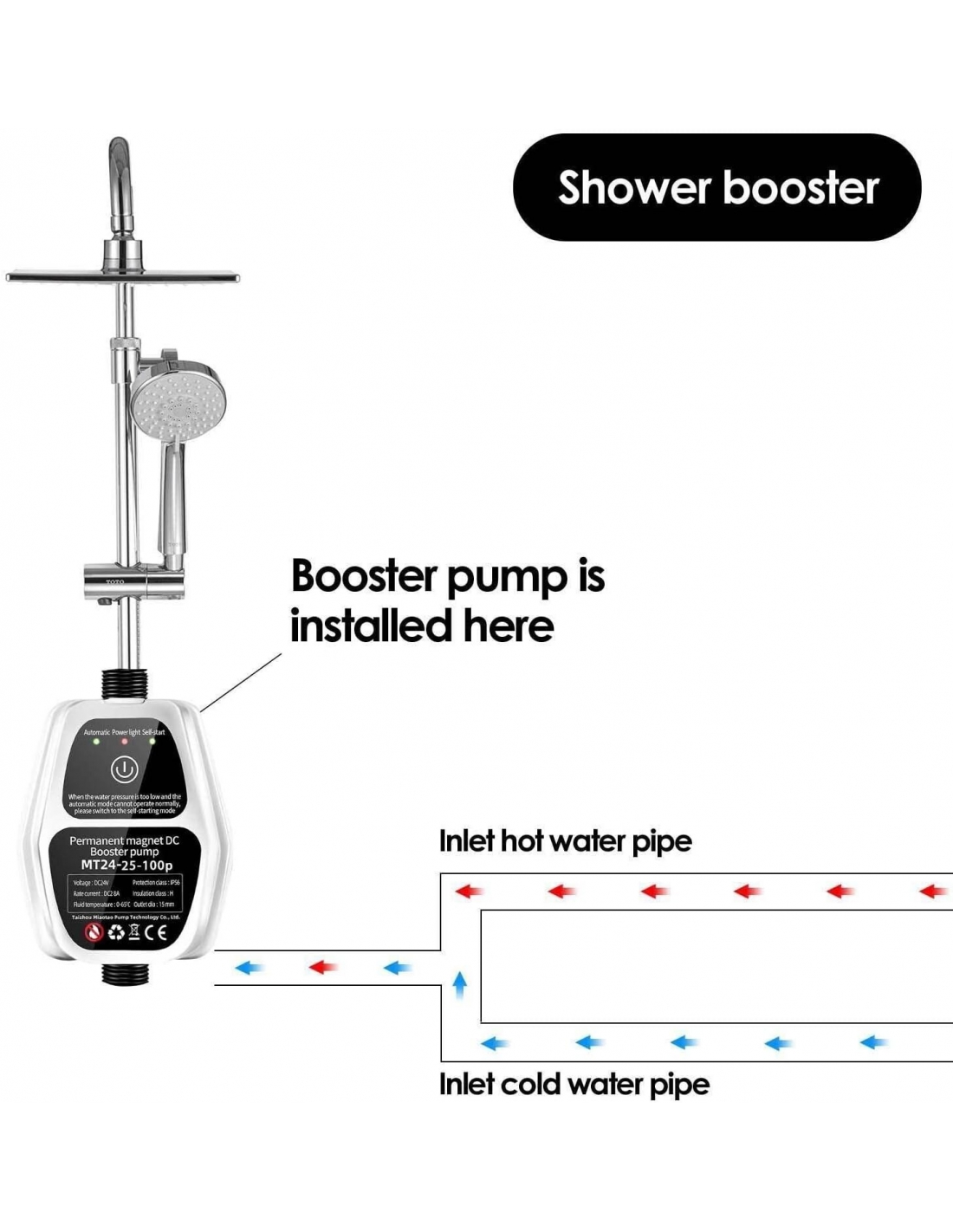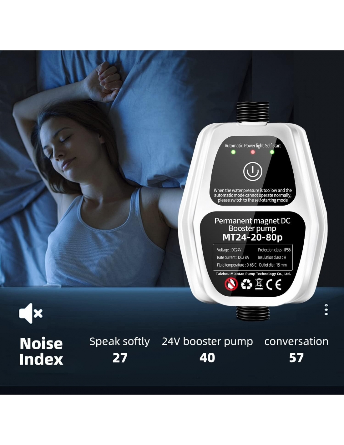 - Impermeabile IP56: la tensione di 24 V DC della pompa di booster automatica silenziosa deve funzionare e non causerà danni al corpo umano. Materiale impermeabile, motore in rame integrato, alta efficienza e basso rumore.