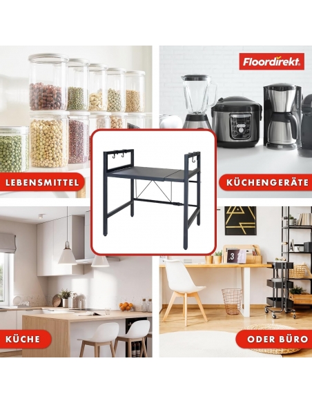 - Versatile funzionalità e flessibilità: il ripiano per microonde Durango si adatta alle vostre esigenze individuali, sia in cucina, in ufficio o in altre stanze. Grazie ai ripiani regolabili in larghezza (da 40 cm a 60 cm) e in altezza, offre una soluzione flessibile per ottimizzare lo spazio disponibile e per riporre oggetti di diverse dimensioni!