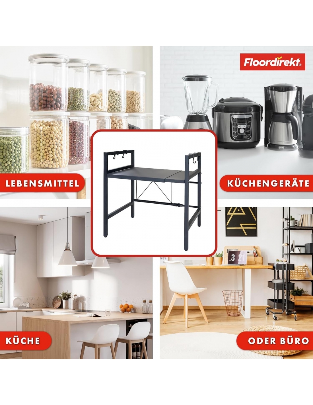 - Conservazione pratica e salvaspazio: l'organizer non solo offre spazio per riporre elettrodomestici più grandi, ma viene fornito anche con tre ganci aggiuntivi che consentono di appendere utensili come spatola, frusta o asciugamani a portata di mano. Questo massimizza lo spazio di archiviazione e garantisce un uso efficiente dello spazio disponibile!
