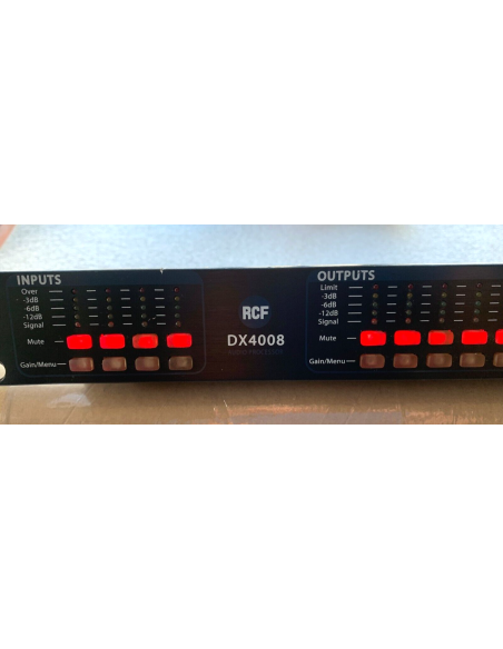 Il DX4008 è un sistema digitale di gestione dei diffusori con 4 ingressi e 8 uscite progettato per l'impiego sia in installazioni fisse che nei tour. E' stata utilizzata la tecnologia più recente con processori a virgola mobile a 32-bit (40-bit, R. estesa) e convertitori analogici ad alte prestazioni a 24-bit. Il DSP (Digital Sound Processor) ad alta risoluzione previene il rumore e la distorsione indotti dagli errori di troncamento che si verificano negli apparecchi a virgola fissa a 24-bit comunemente utilizzati. Il set completo di parametri comprende livelli I/O, delay, polarità, EQ parametrico a 6 bande per canale, selezione di più crossover e limiter completi. Il DX4008 può essere comandato o configurato in tempo reale dal pannello frontale o dall'intuitiva interfaccia grafica per PC a cui si accede tramite porta seriale RS-232. L' upgrade del software per il CPU e il DSP tramite PC mantiene l'apparecchio aggiornato con gli algoritmi e le nuove funzioni di nuove introduzione di volta in volta disponibili. La memorizzazione di più configurazioni e un sistema di sicurezza a password, completano il dispositivo. Il DX4008 viene fornito con la speciale applicazione per PC Graphic User Iterface (GUI)