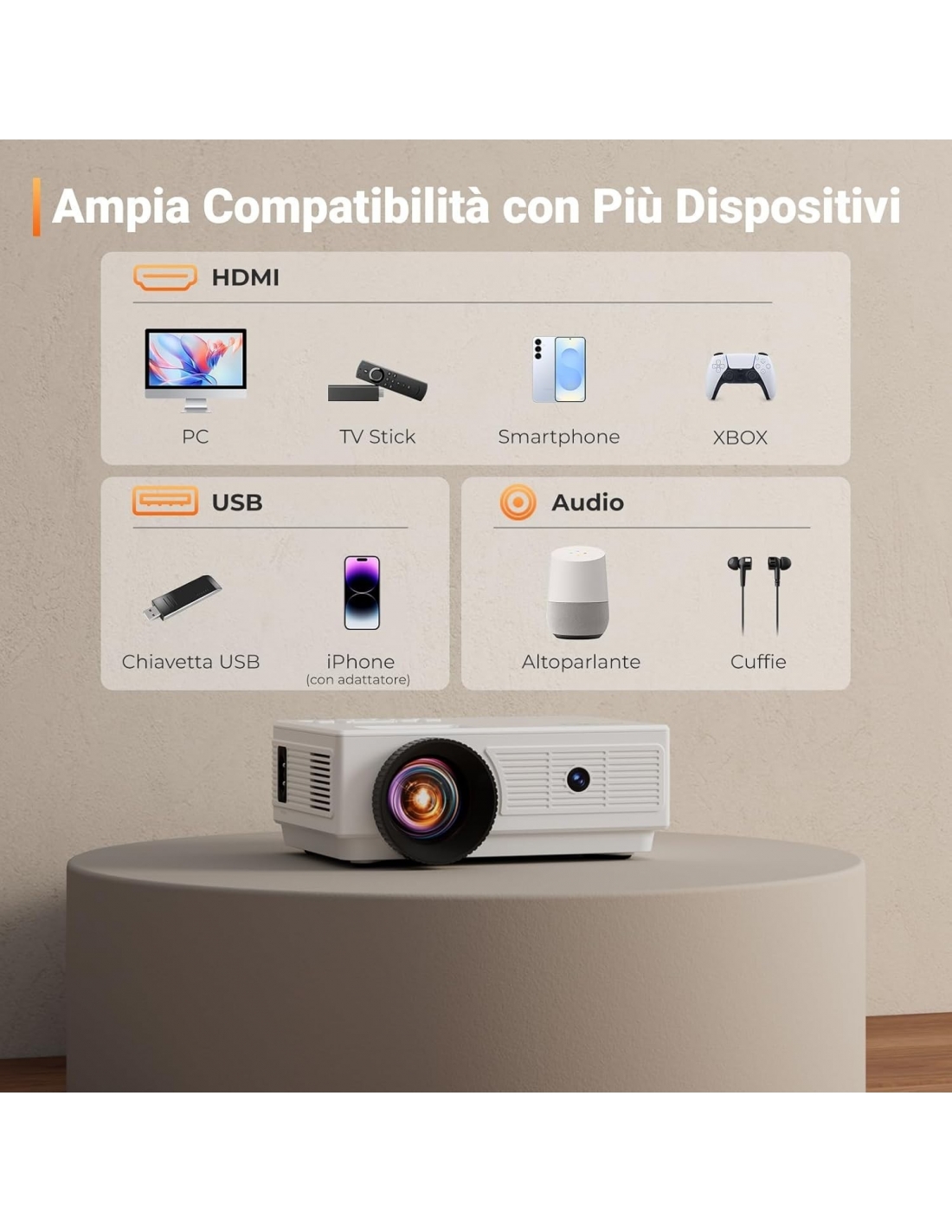 - 【Ampia compatibilità e supporto tecnico affidabile】The Konsoefuly projector è dotato di porte HDMI, USB e audio, compatibili con una vasta gamma di dispositivi come smartphone, laptop, console di gioco, unità USB, altoparlanti esterni e Fire Stick. Inoltre, il marchio Konsoefuly offre un supporto tecnico continuo per assisterti in ogni fase dell'utilizzo