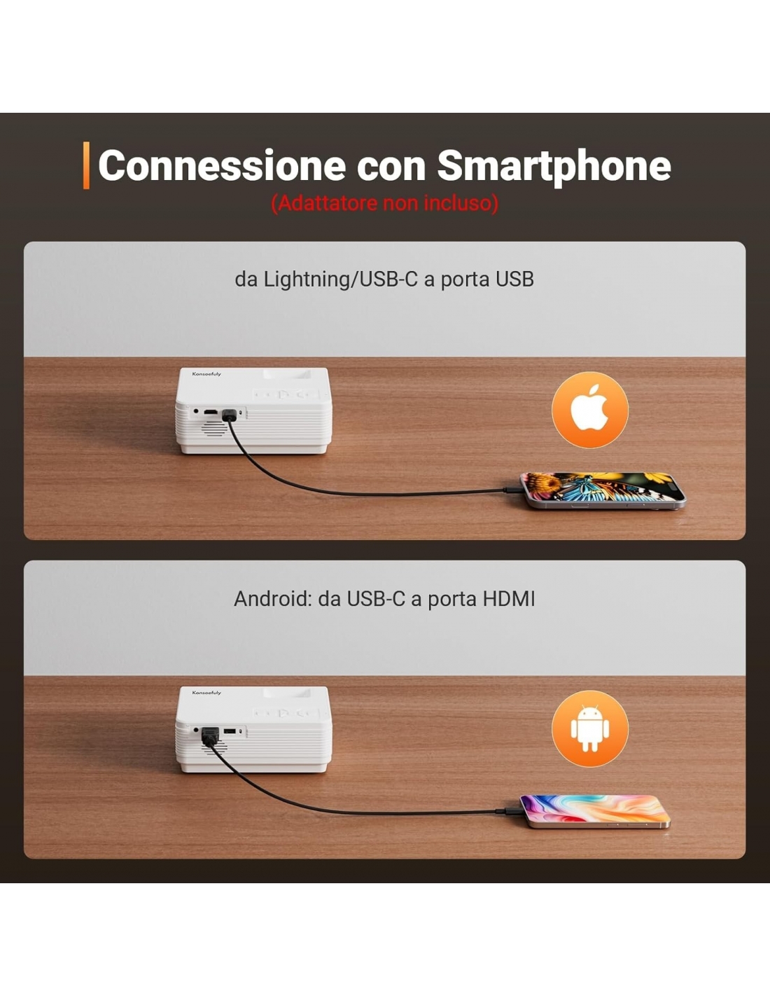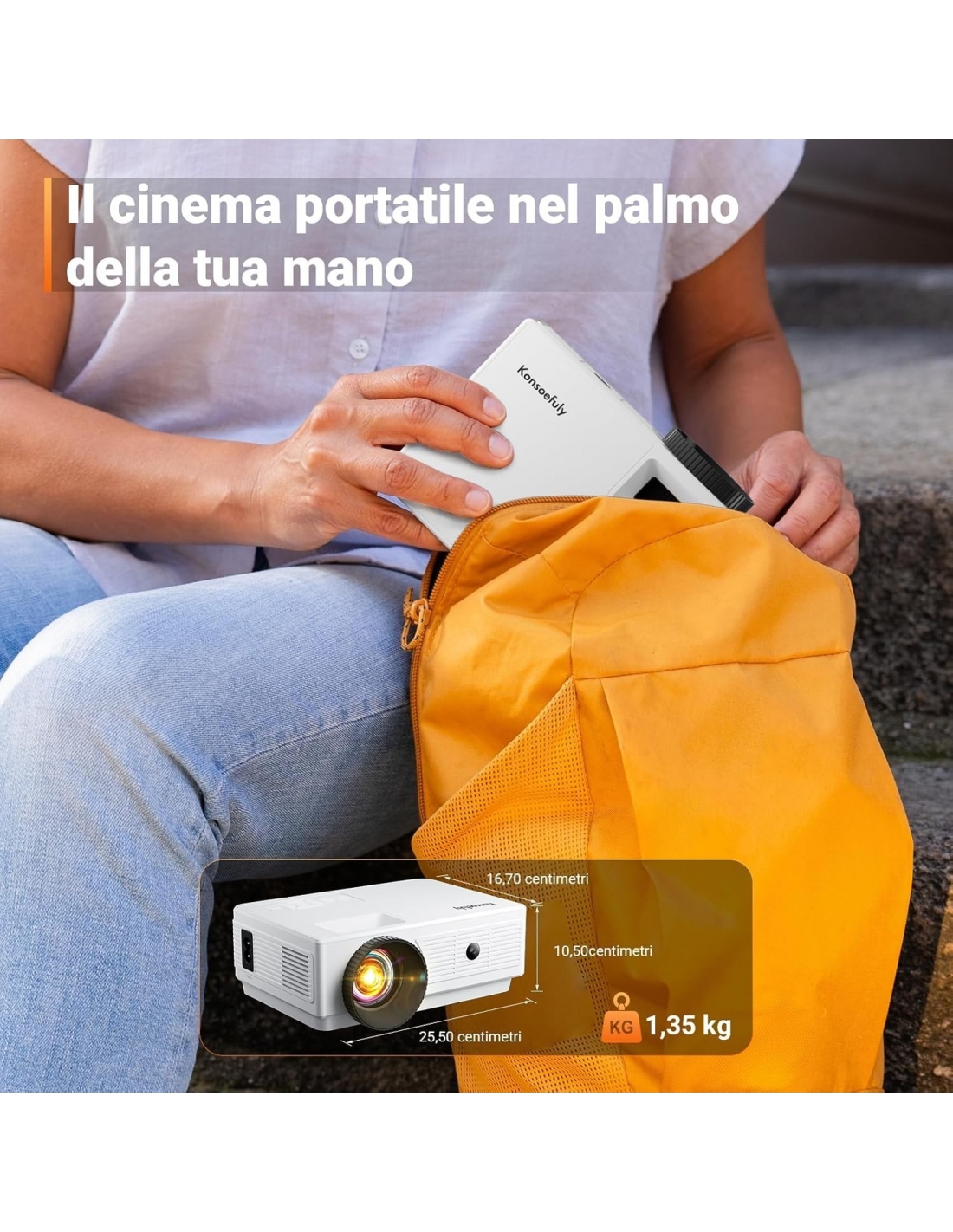 - 【Compatibile con iPhone e Pico】The Konsoefuly mini proiettore si collega facilmente al tuo iPhone utilizzando il cavo di alimentazione originale (non incluso) ed è estremamente portatile, con dimensioni compatte di 17 x 13 x 7,1 cm e un peso di soli 589,67 grammi, offrendo un'esperienza visiva eccellente ovunque tu sia
