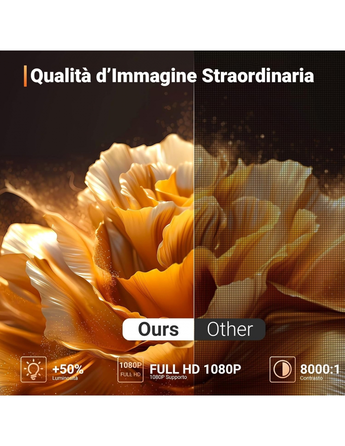 - 【Zoom regolabile e correzione trapezoidale】The proiettore portatile supporta la risoluzione nativa Full HD 1080P e la riproduzione di contenuti 4K, con una luminosità eccezionale e un contrasto di 10000:1 per offrire un'esperienza visiva superiore. La funzione di zoom consente di regolare facilmente l'immagine dal 50% al 100% senza spostare il mini proiettore, adattandosi perfettamente alle tue esigenze. Inoltre, la correzione trapezoidale di ±30° aiuta a ottenere immagini sempre nitide e ben proporzionate