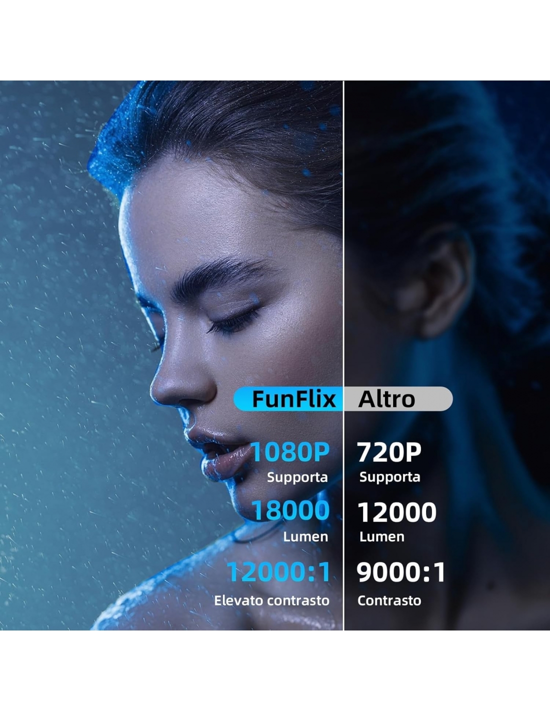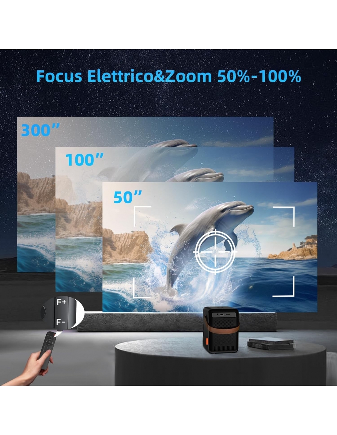 - 🔔【Focus Elettrico& Correzione 4D + Zoom】Il videoproiettore FunFlix realizza la messa a fuoco con un solo tocco, eliminando la messa a fuoco manuale. Correzione trapezoidale creativa a quattro angoli, per cambiare a piacimento la posizione dell'angolo di visione dello schermo, senza bisogno di spostare il proiettore. Funzione di zoom intelligente dal 50% al 100%, per godere di un grande schermo ultra chiaro da 300", senza doversi preoccupare della distanza di posizionamento del proiettore.
