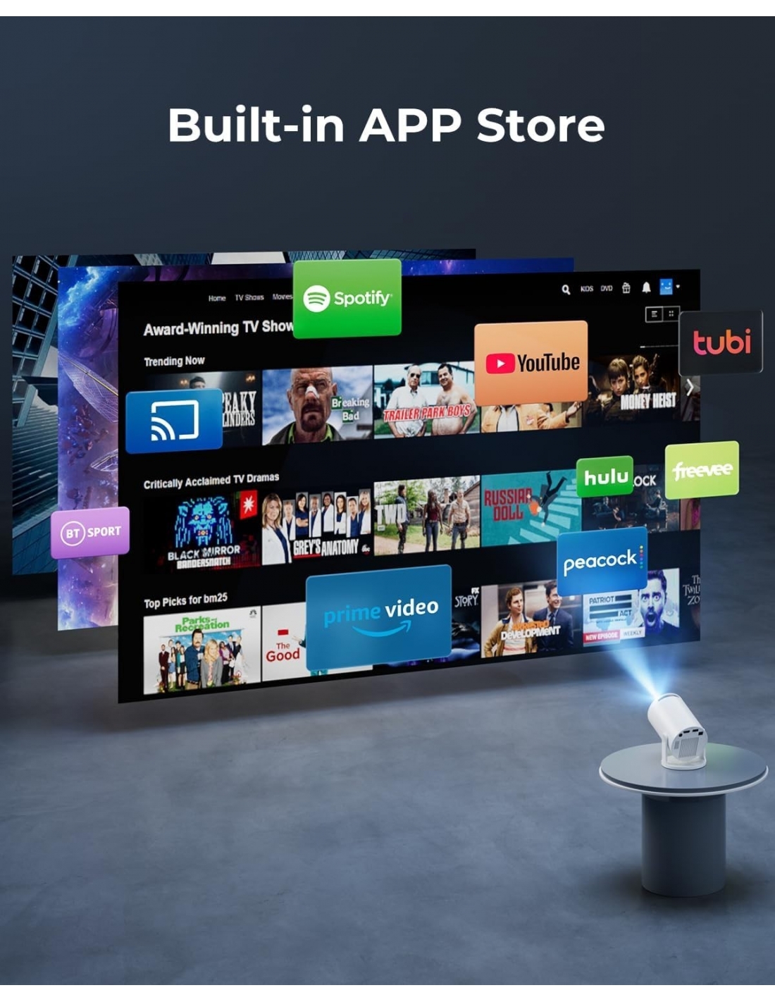 - [Video proiettore con app integrate] Questo mini videoproiettore portatile funziona con Android 11 ed è dotato di oltre 8.000 app integrate, tra cui Prime Video e YouTube, che ti consentono di accedere facilmente a una vasta libreria di video di alta qualità senza bisogno di dispositivi esterni.