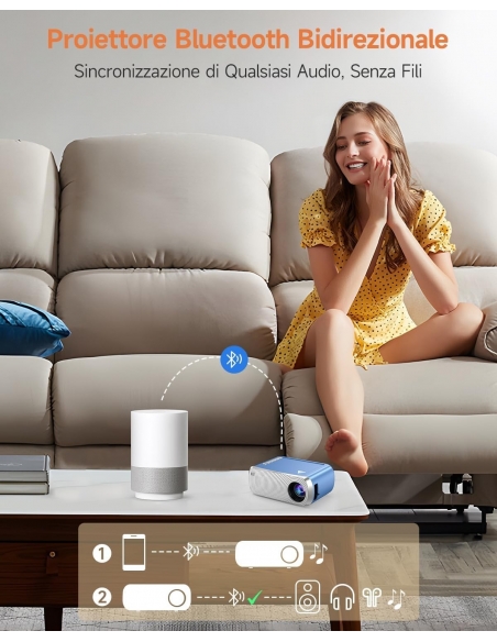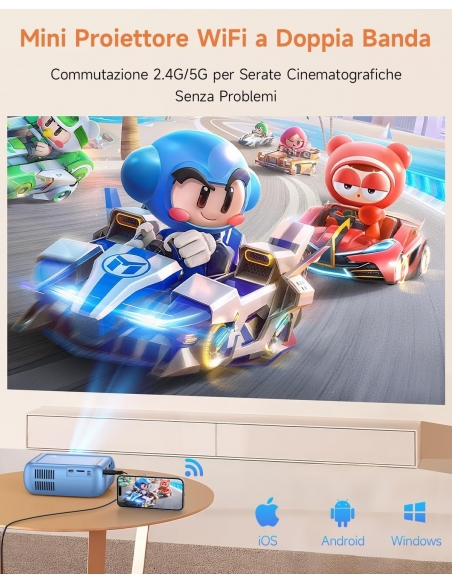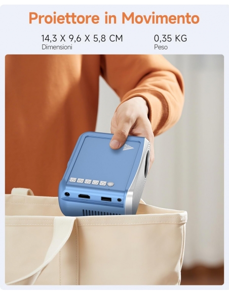- 【Mini Proiettore Portatile FHD 1080P per iPhone】 Dotato di tecnologia LED con illuminazione uniforme per immagini luminose e nitide. Il mini proiettore Bluetooth supporta una risoluzione di 1920x1080P con schermi da 22-170 pollici. Compatto e leggero (14 x 9,6 x 5,4 cm, 0,34 kg), è facile da trasportare e ideale per spazi ridotti come dormitori o camere da letto senza TV.