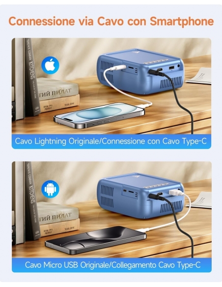 - 【Connettività WiFi e Screen Mirroring】 Il mini proiettore per iPhone supporta la connettività wireless WiFi ed è compatibile con Android/iPhone/Windows. È possibile collegare facilmente il proprio dispositivo iPhone/Android in modalità wireless semplicemente connettendosi allo stesso WiFi, senza restrizioni di cavi. Quando non è disponibile un ambiente Wi-Fi, è possibile collegare facilmente il proiettore WiFi al proprio dispositivo utilizzando il cavo originale di tipo C e HDMI.