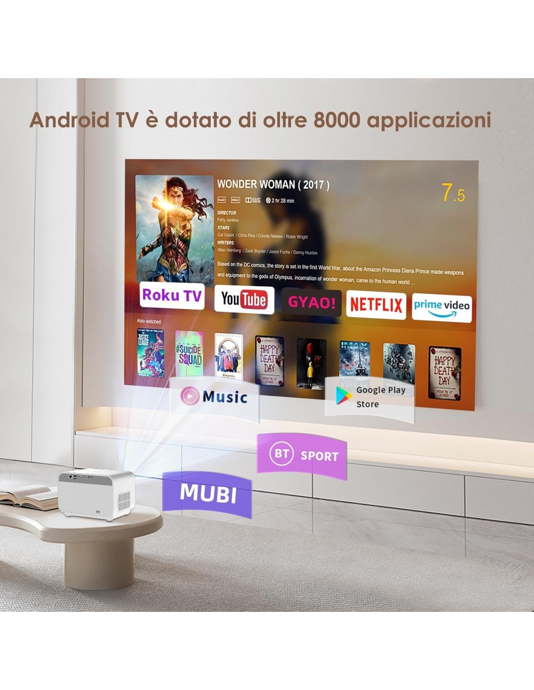 - 【Android TV avanzato integrato e suono HI-FI *2】 Il proiettore domestico è dotato di un sistema Android TV, che supporta oltre 8000 flussi video, inclusi YouTube, Netflix, Prime, Disney+ e altro ancora. Non c'è bisogno di un TV box o di una chiavetta TV, sblocca facilmente più canali e video di grandi dimensioni. Allo stesso tempo, il proiettore Bluetooth è dotato di due altoparlanti HI-FI ad alta fedeltà, che ti consentono di godere di effetti audio surround a 360° come in un home cinema.