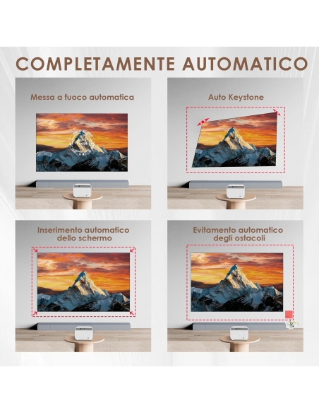 - 【Regolazione intelligente dello schermo】Il nuovo proiettore Full HD A1 adotta la più avanzata tecnologia di messa a fuoco automatica, calibrazione automatica, input automatico dello schermo e prevenzione automatica degli ostacoli. Spostati e posiziona liberamente all'aperto e al chiuso e il proiettore presenterà automaticamente immagini chiare e vivide, regolerà automaticamente la forma dello schermo ed eviterà la proiezione dagli ostacoli. Offri un'esperienza visiva rilassata e piacevole.