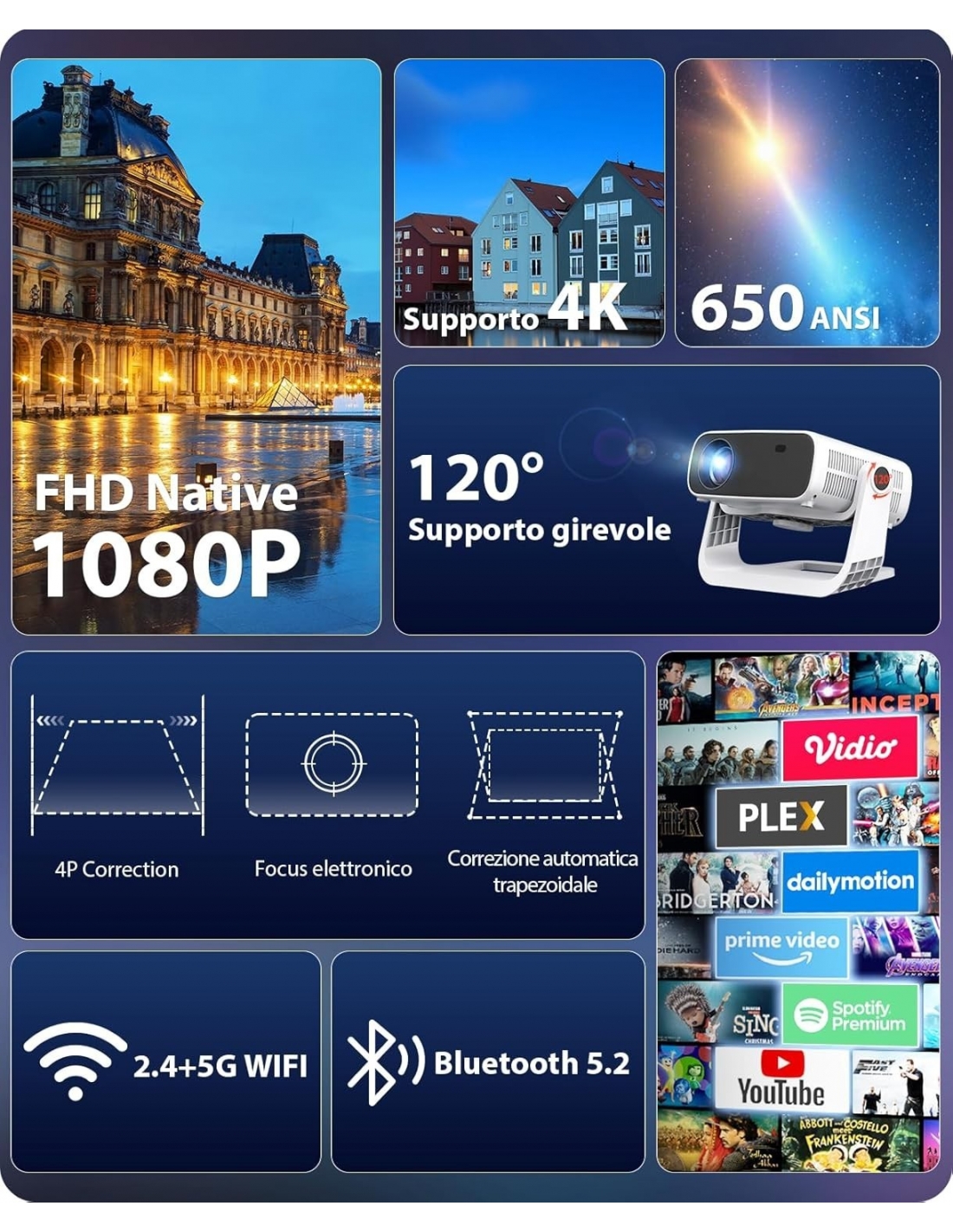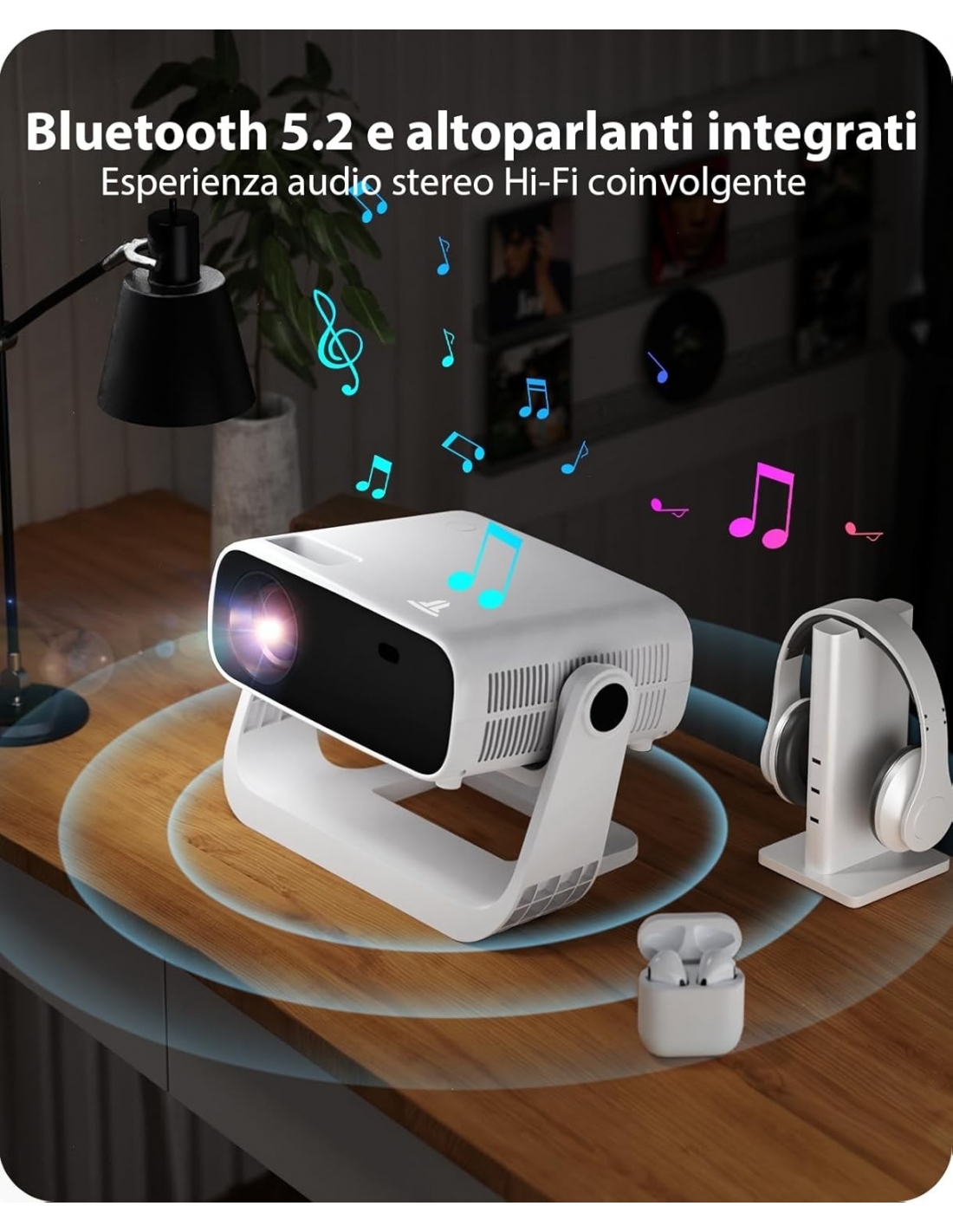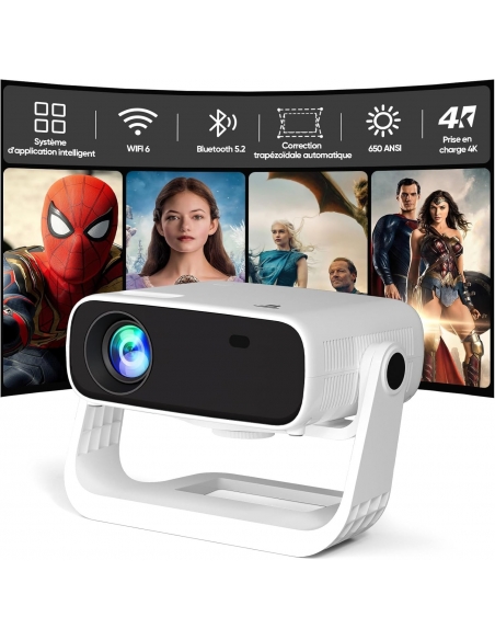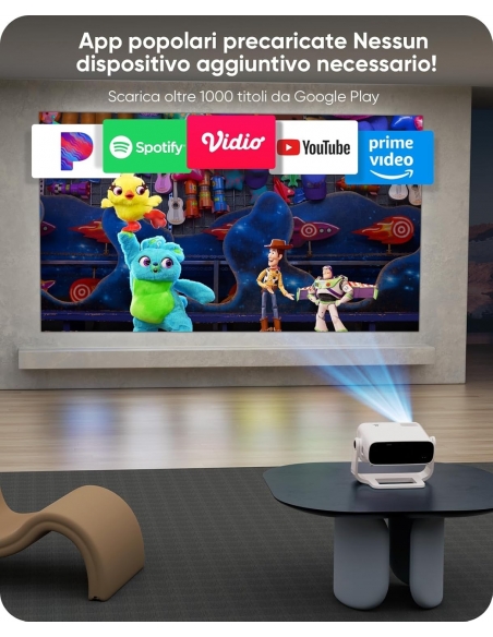 WIELIO AT-M269D Proiettore intelligente Android 11, Supporto FHD 1080P 4K, 650 ANSI, WiFi6 & BT5.2, Basso Rumore (<30 dB), Supporto Regolabile a 120°, Correzione Trapezoidale, per Android/iOS/Switch/PS5