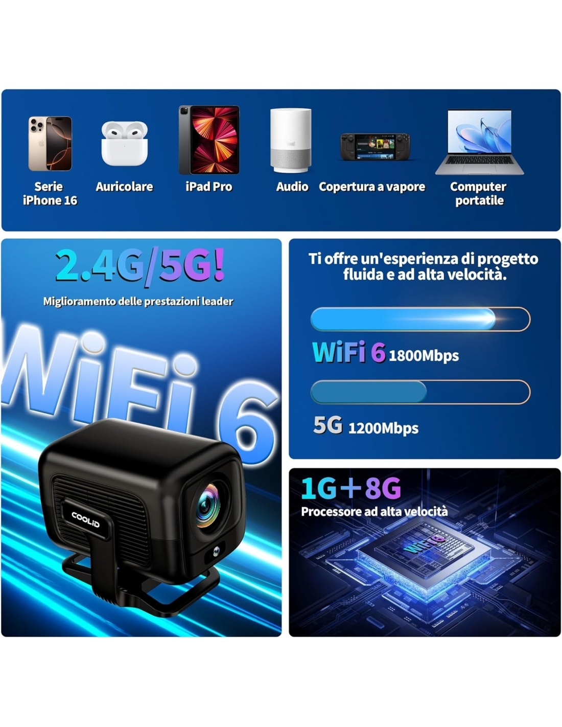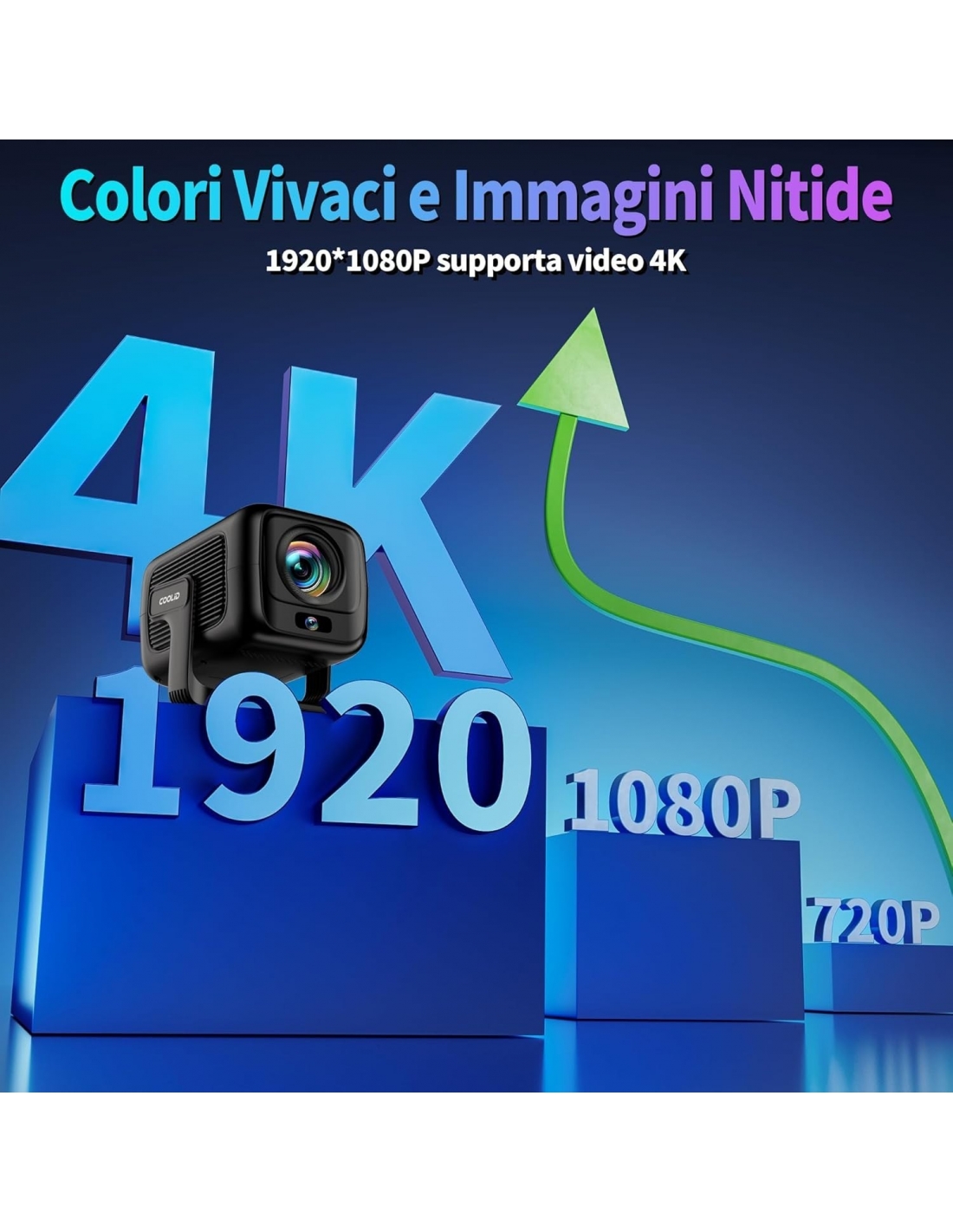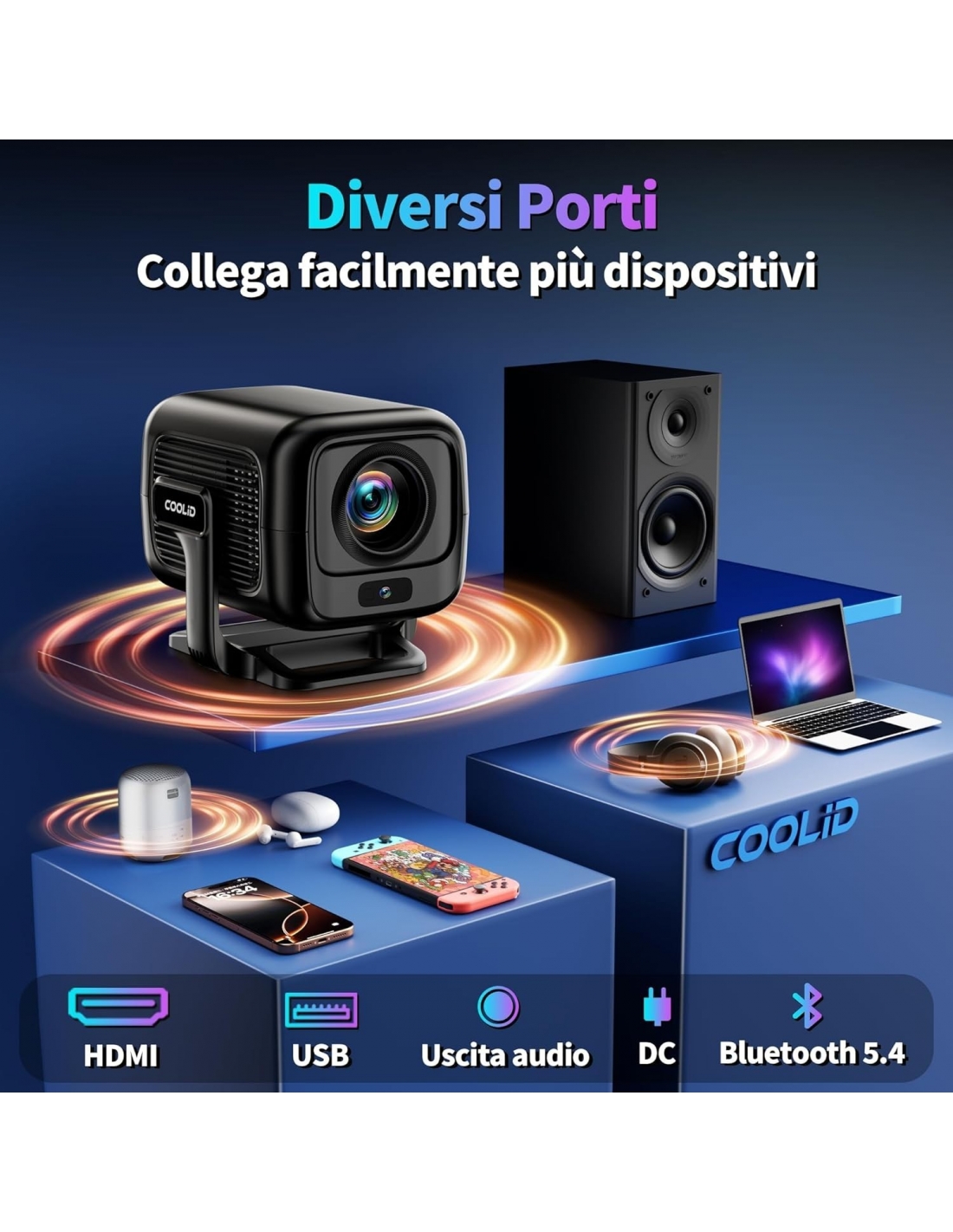 COOLID HY300Pro Proiettore Portatile 1080P HD, Mini Proiettore WiFi 6 Bluetooth 5.4 Videoproiettore Focus Elettronico Auto Keystone App Integrata, iOS/Android TV/Chiavetta TV/USB/Laptop