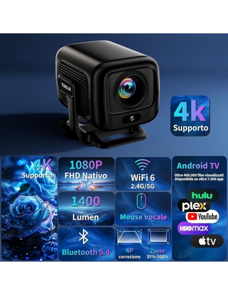 - 【Proiettore Connessione ad Alta Velocità ed Espansione Audio】Proiettore portatile supporta il WiFi 6 e il Bluetooth 5.4, offrendo una connessione di rete ad alta velocità e a bassa interferenza e altoparlanti integrati per una visione immediata; supporta la trasmissione audio bidirezionale Bluetooth 5.4, che può essere facilmente collegata a telefoni cellulari, computer portatili, cuffie o altoparlanti, e migliora in modo flessibile la qualità audio.
