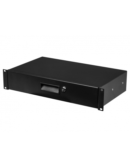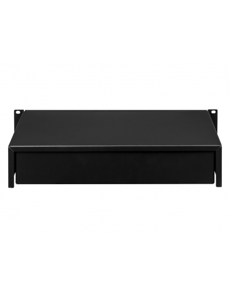 Cassetto 2U rack da 19" in acciaio verniciato con guide telescopiche zincate. Larghezza interna: 400 mm. Profondità interna: 250 mm. Finitura nero goffrato.