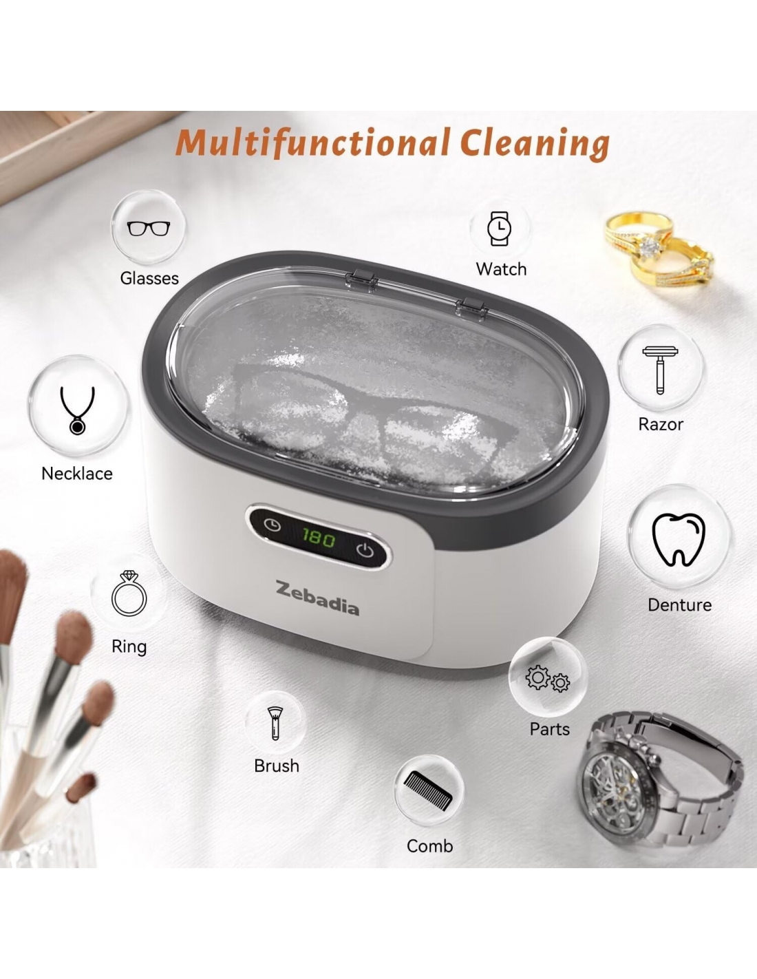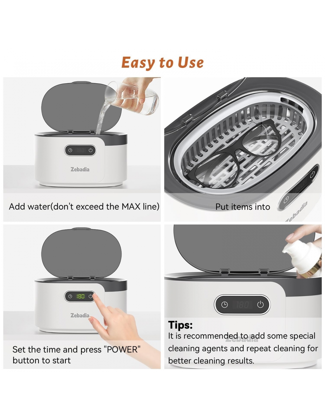 - Il pulitore a ultrasuoni ZEBADIA può pulire occhiali, occhiali da sole, cinturini per orologi, collane, anelli, gioielli in argento, testine per spazzolini da denti e particelle/sporcizia negli spazi tra i gioielli in pochi minuti utilizzando solo acqua di rubinetto. Questo è qualcosa che non può essere raggiunto con la pulizia manuale. Dopo la pulizia, si prega di pulire la superficie con un panno per la pulizia per ripristinarne la lucentezza