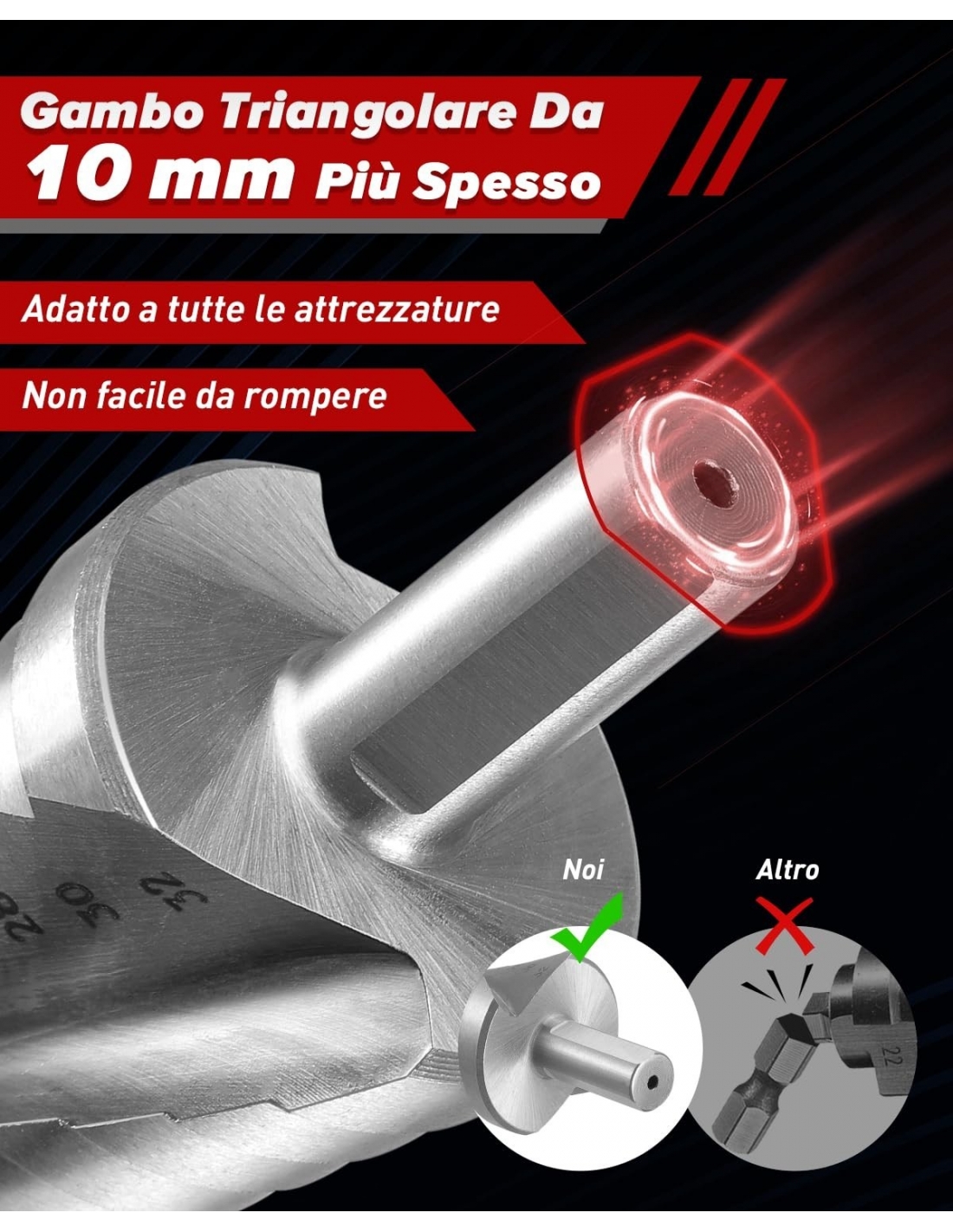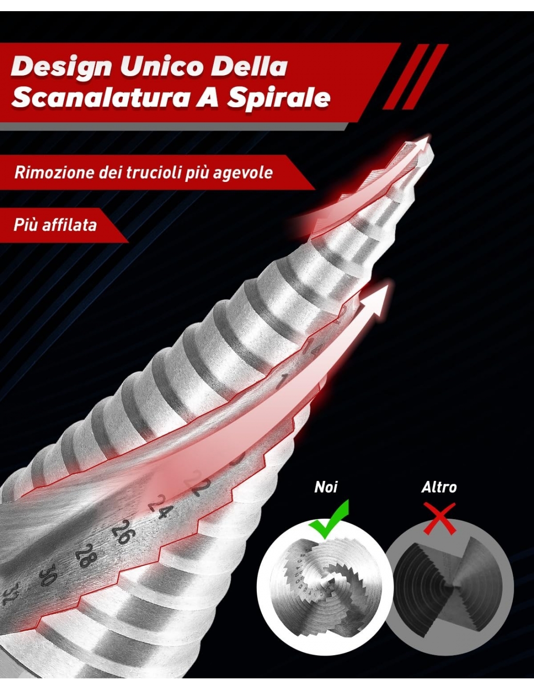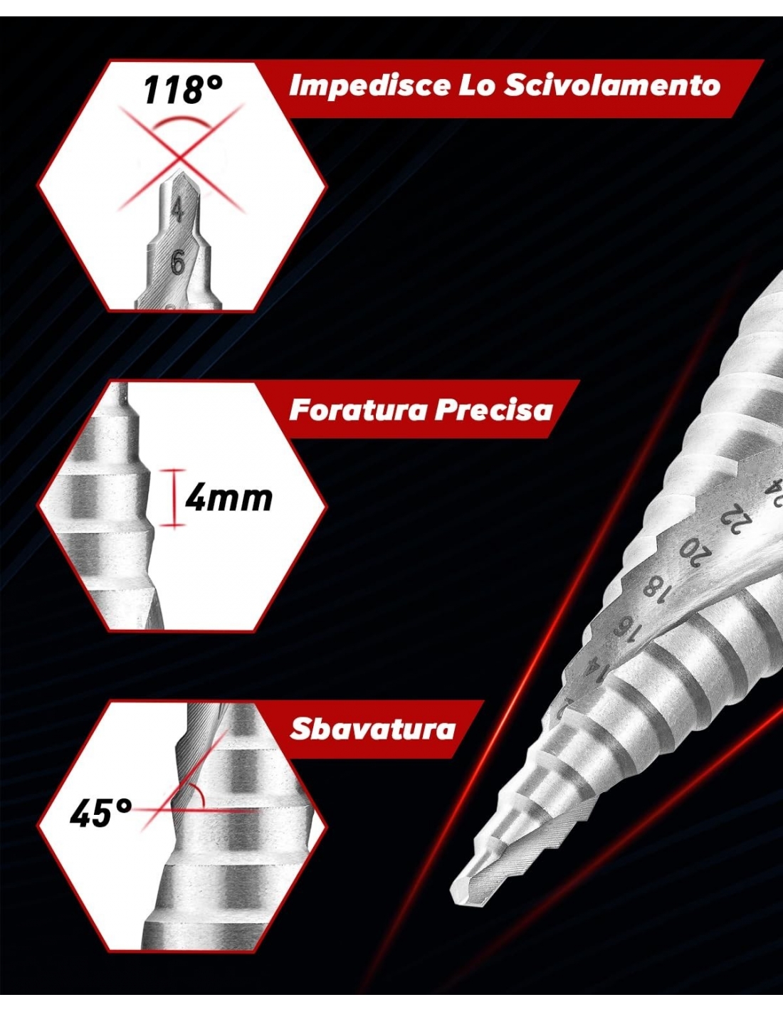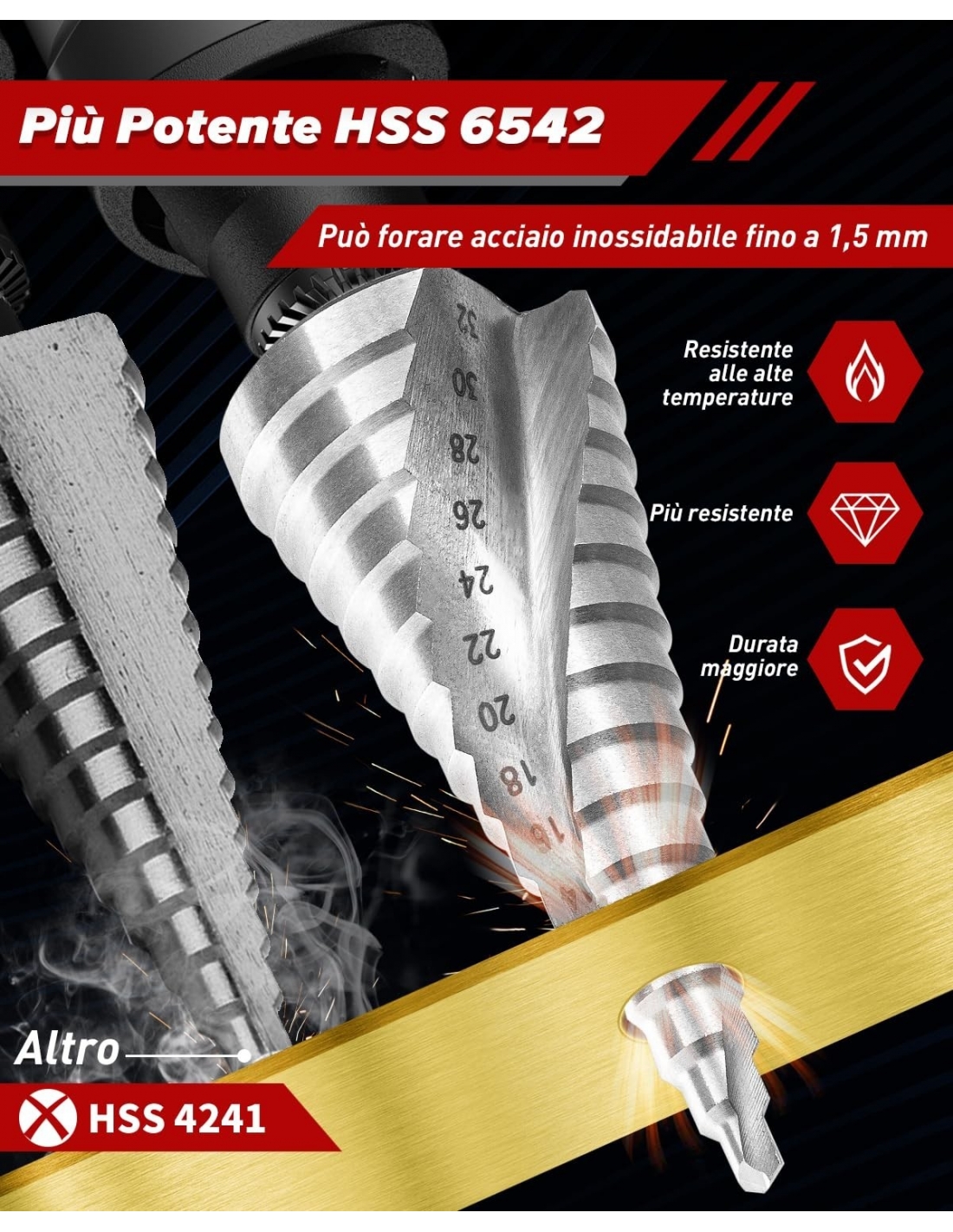 - UTILIZZA MATERIALI DI MIGLIORE QUALITÀ: l'alta durezza HSS 6542 è perfetta per i metalli e può forare l'acciaio inossidabile fino a 1,5 mm, cosa che non è possibile con altre punte HSS 4241 di qualità inferiore presenti sul mercato.