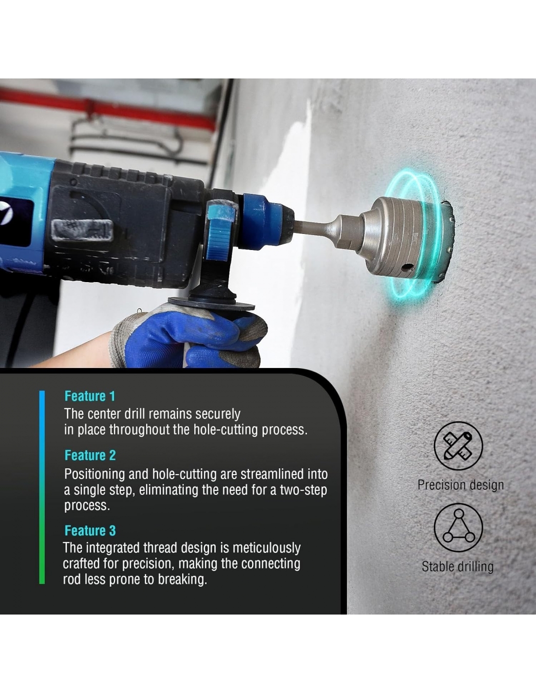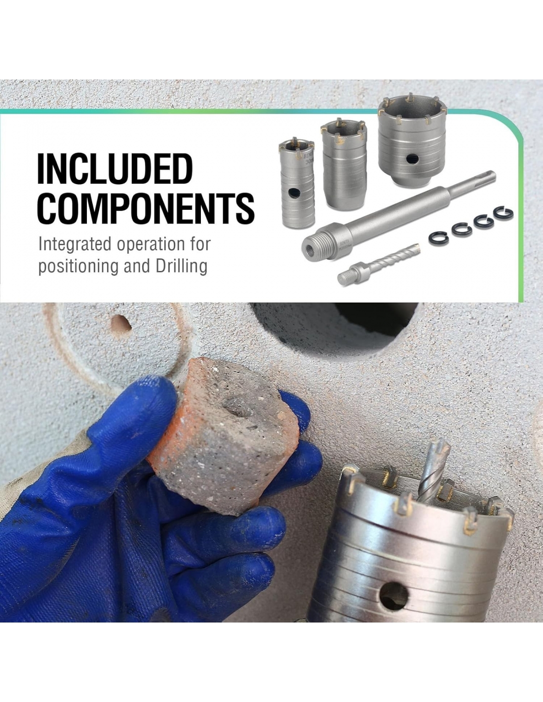 - APPLICAZIONE: 1. Utilizzato per perforare materiali come calcestruzzo, adobe, cemento, mattoni, pareti e arenaria. 2. Utilizzato per la perforazione in scenari come scatole per prese, condizionatori d’aria, tubature, scaldabagni, tubi dell’olio e scarichi, ecc.