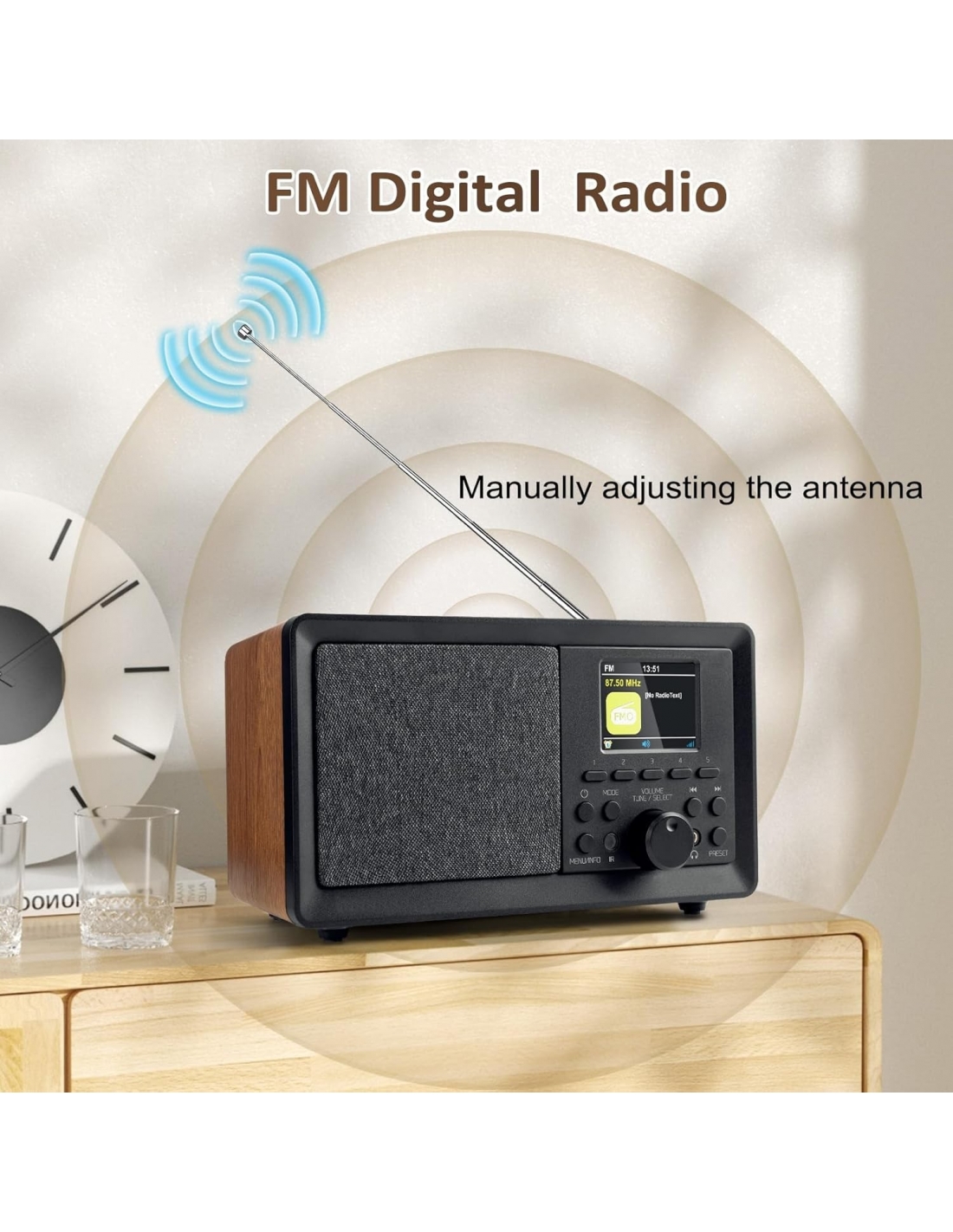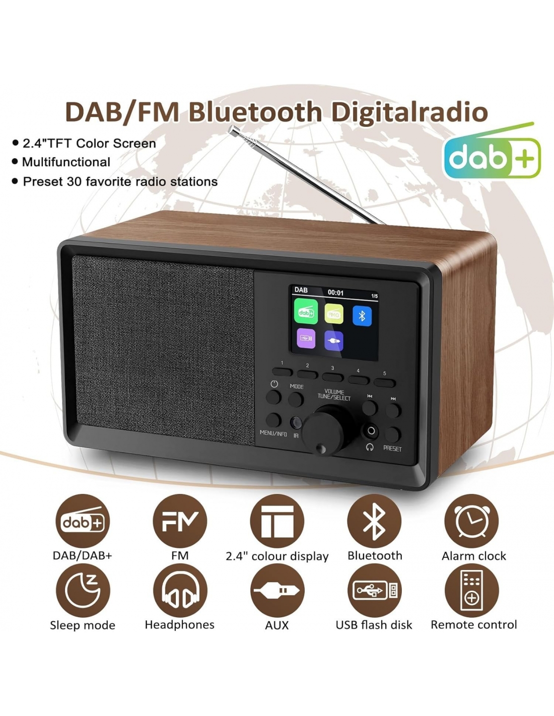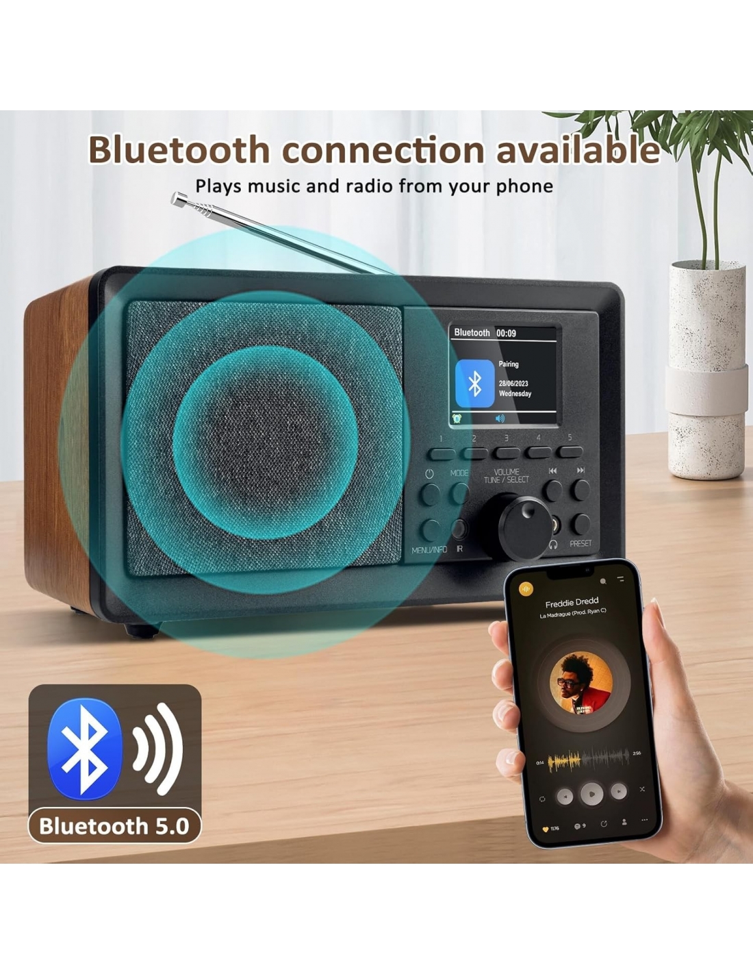 - Radio digitale multifunziole, radio digitale DAB/DAB+/FM, radio FM e radio digitale DAB+ offrono u vasta gamma di suoni digitali altamente dettagliati, configurazione semplice e rapida ricerca automatica. Display a colori TFT da 2,4" per una visualizzazione più chiara di canali e menu, aggiornamenti intelligenti per una facile configurazione e navigazione. Esclusivo legno di eucalipto per un classico ed elegante retro Altoparlante Bluetooth Lui.