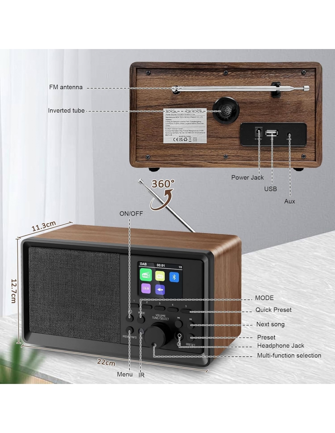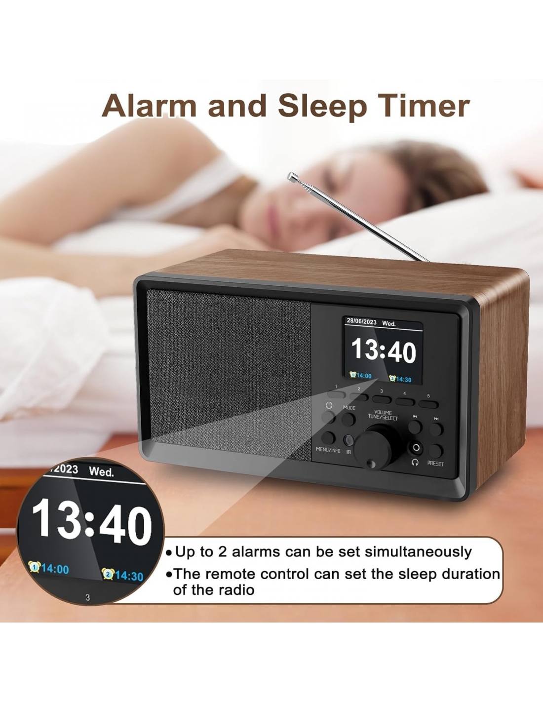 - Diverse impostazioni personalizzabili. Doppia sveglia: è possibile impostare 2 sveglie contemporaneamente. Funzione timer sleep: È possibile impostare il tempo di standby della radio in 8 livelli di tempo (15 minuti/30 minuti/45 minuti/60 minuti/75 minuti/90 minuti/105 minuti/120 minuti). Supporto per il funzionamento del sistema multilingue (6 lingue). Supporto per la regolazione della data, della suoneria, del numero di suoneria. elzeichen e molti altre impostazioni.