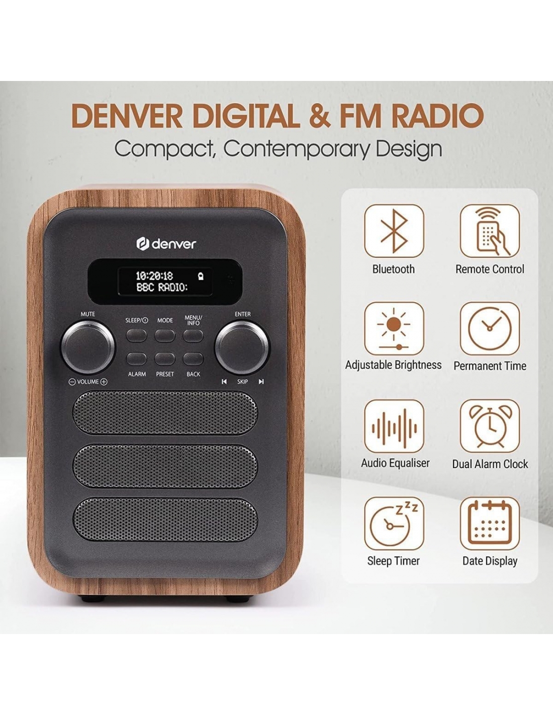 - Sveglia con doppia sveglia. Il suono della sveglia può essere programmato per la riproduzione con radio FM, radio DAB o con una melodia.