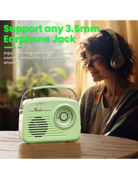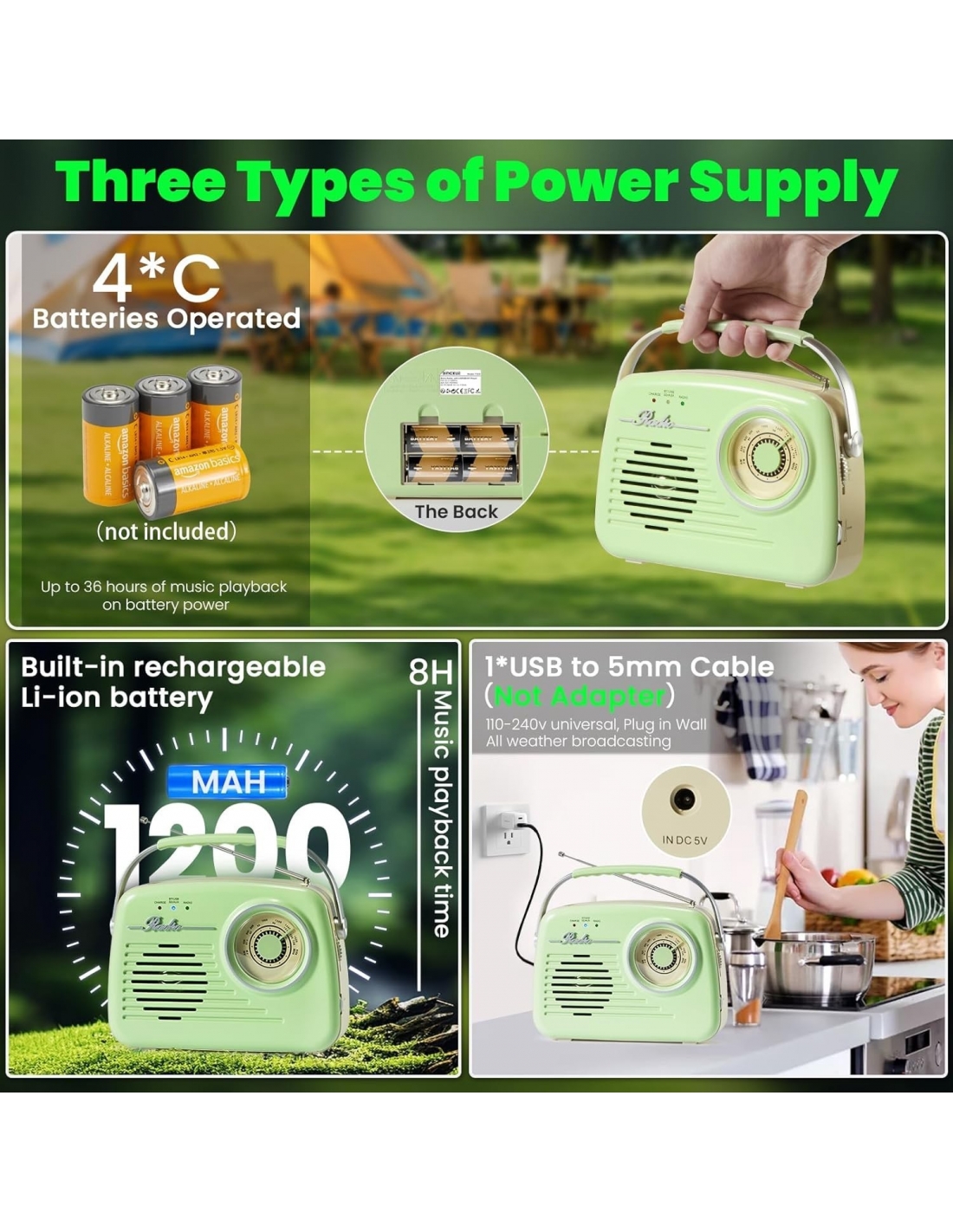 - 【Tre opzioni di alimentazione】Questa radio vintage ha una batteria integrata da 1200 mAh per una riproduzione musicale in standby prolungata fino a 8 ore; quando si campeggia all'aperto, collegare 4 batterie C (non incluse) alla radio a batteria per godere di lunghe ore di utilizzo wireless; quando si utilizza in camera da letto, cucina o ufficio, collegare il cavo di ricarica (adattatore USB non incluso) alla presa a muro per ascoltare la radio tutto il giorno.
