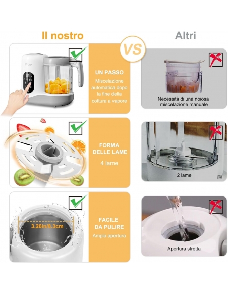 - 💖【Facile da Usare e Pulire】Dotato di una ciotola di miscelazione da 400 ml e 4 lame di alta qualità che funzionano a 2875R al minuto, cuoci pappa per neonati prepara rapidamente i pasti. La sua funzione di autolavaggio è un risparmio di tempo per le mamme occupate: basta aggiungere acqua pulita e la macchina fa il resto! 👉NOTA: Mantenere l'elettrodomestico vuoto e asciutto quando non è in uso.