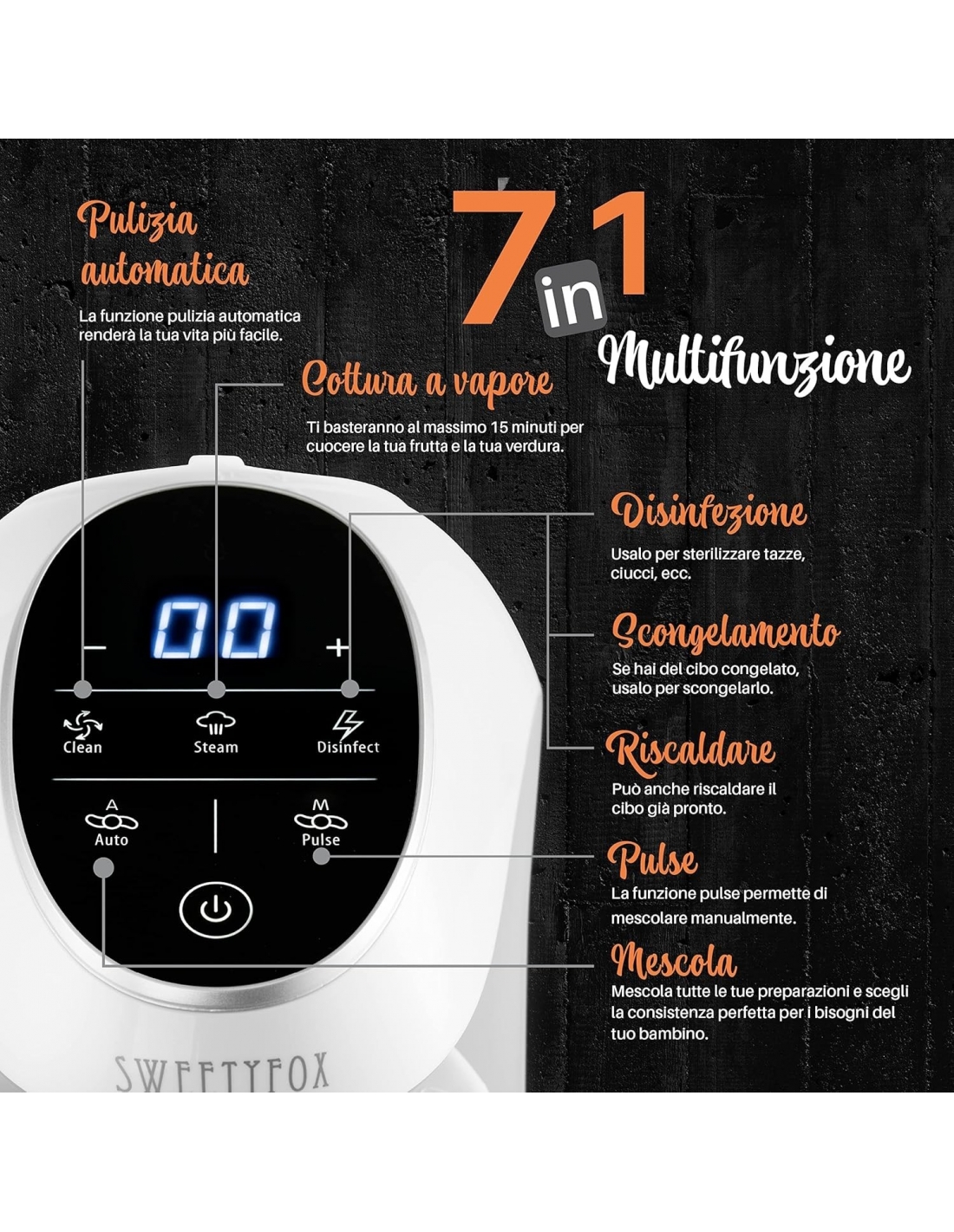 Sweety Fox Cuocipappa Mixer Multifunzione 7-in-1 per Bébé - Vapore, Mixer, Pulse, Pulizia Automatica, Sterilizzato, Riscalda, Scongela - Robot Cucina Multifunzione