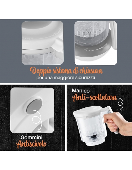 - QUALITÀ E SICUREZZA VI ASPETTANO - Il cuocipappa omogeneizzatore è garantito senza BPA per proteggere la salute del vostro bambino! E per la vostra sicurezza, il robot è dotato di una funzione anti surriscaldamento, di un manico antibruciatura e di un blocco di sicurezza che impedisce alle lame di entrare in funzione se il frullatore, il cestello e il coperchio non sono installati correttamente.