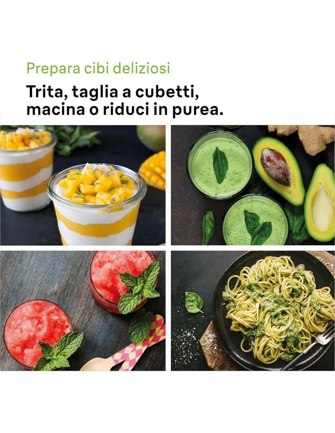 - PERFETTO PER OGNI RICETTA: include un frullatore per frullati e bevande ghiacciate, un tritatutto da 350ml per tritare formaggi duri, noci, erbe, carote in pochi secondi, una frusta e un bicchiere da 600ml per liberare la tua creatività in cucina