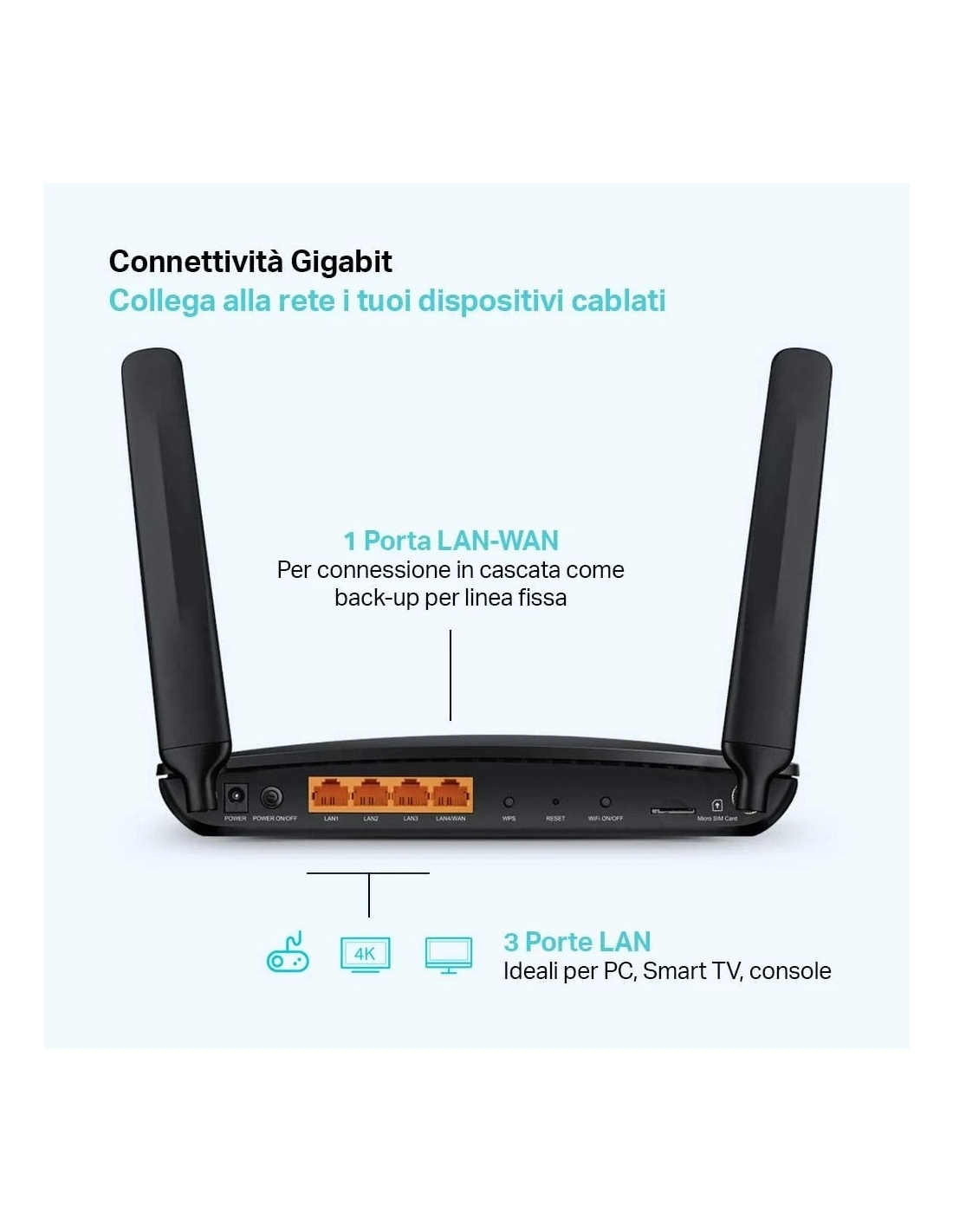 - 4 PORTE GIGABIT ETHERNET - Forniscono connessioni cablate ad alta velocità per il collegamento di un dispositivo cablato come console di gioco, una TV o un lettore di streaming