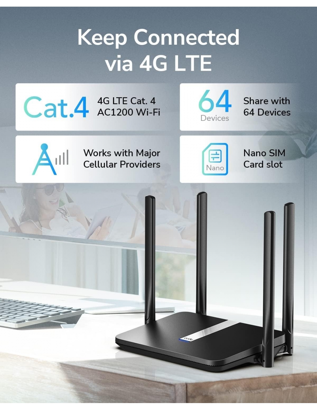 Cudy LT500 WiFi Mesh Router 4G LTE Dual-Band 1200Mbps 4 porte 100Mbps LAN/WAN, 4 antenne 5 dBi, DDNS, FDD and TDD, VPN, SIM Collega e usa, Alternativa per ADSL