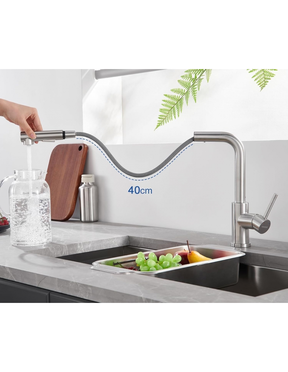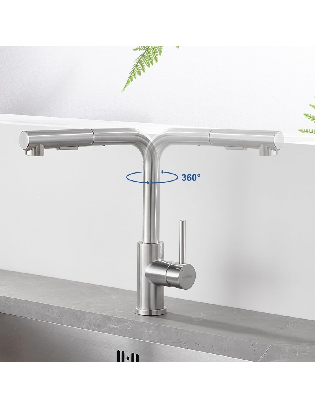 WOOHSE Rubinetto Cucina con Doccetta Estraibile, Miscelatore Cucina Girevole a 360°, Rubinetti Cucina con 2 tipi di Getto, Rubinetto Lavello in Acciaio inox Spazzolato, Fontana Lavello Cucina